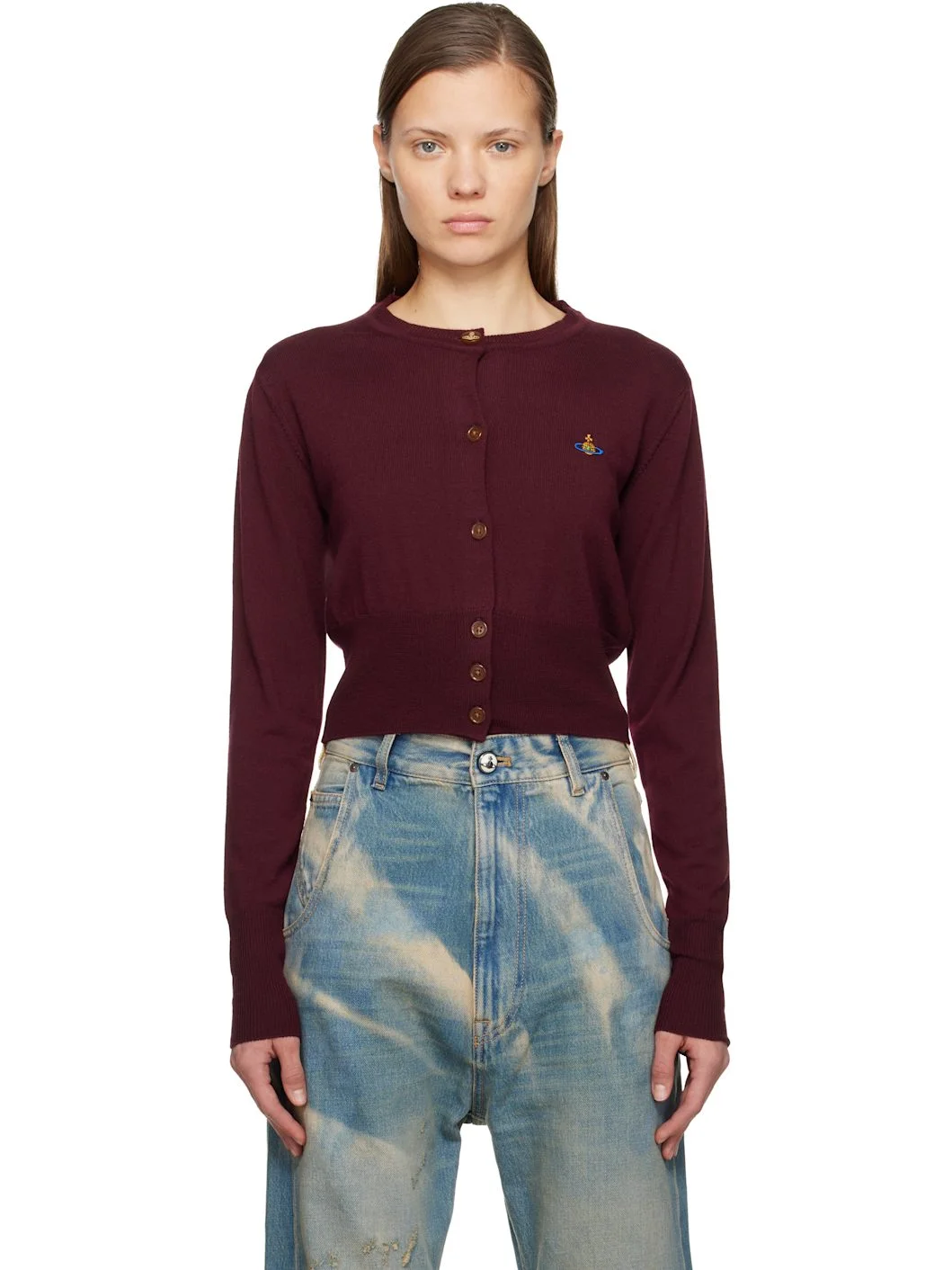 Knit virgin wool cardigan. · Rib-knit crewneck, hem, and cuffs · Button closure · Logo embroidered at chest · Cropped hem Supplier color: Brick 100% virgin wool. Made in Italy 252314F095012