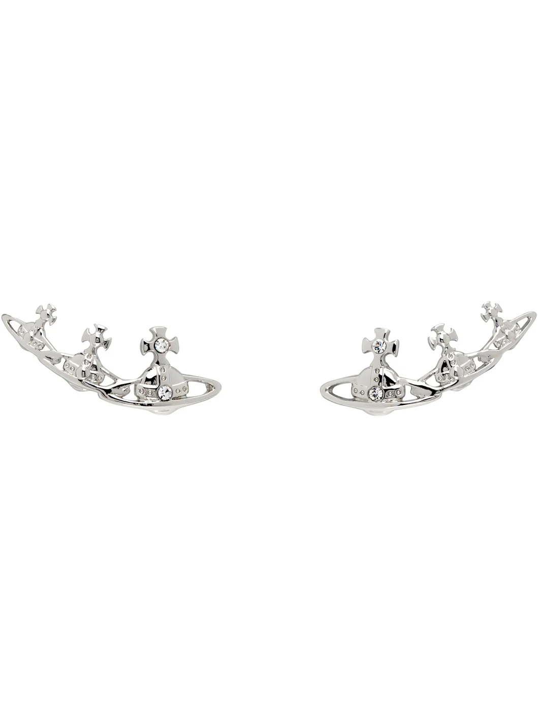 Pair of stud earrings in silver-tone brass. · Logo with crystals at face · Post-stud fastening · H0.25" x W1" Supplier color: Platinum/Crystal crystal Brass, crystal. Made in Thailand 252314F022014