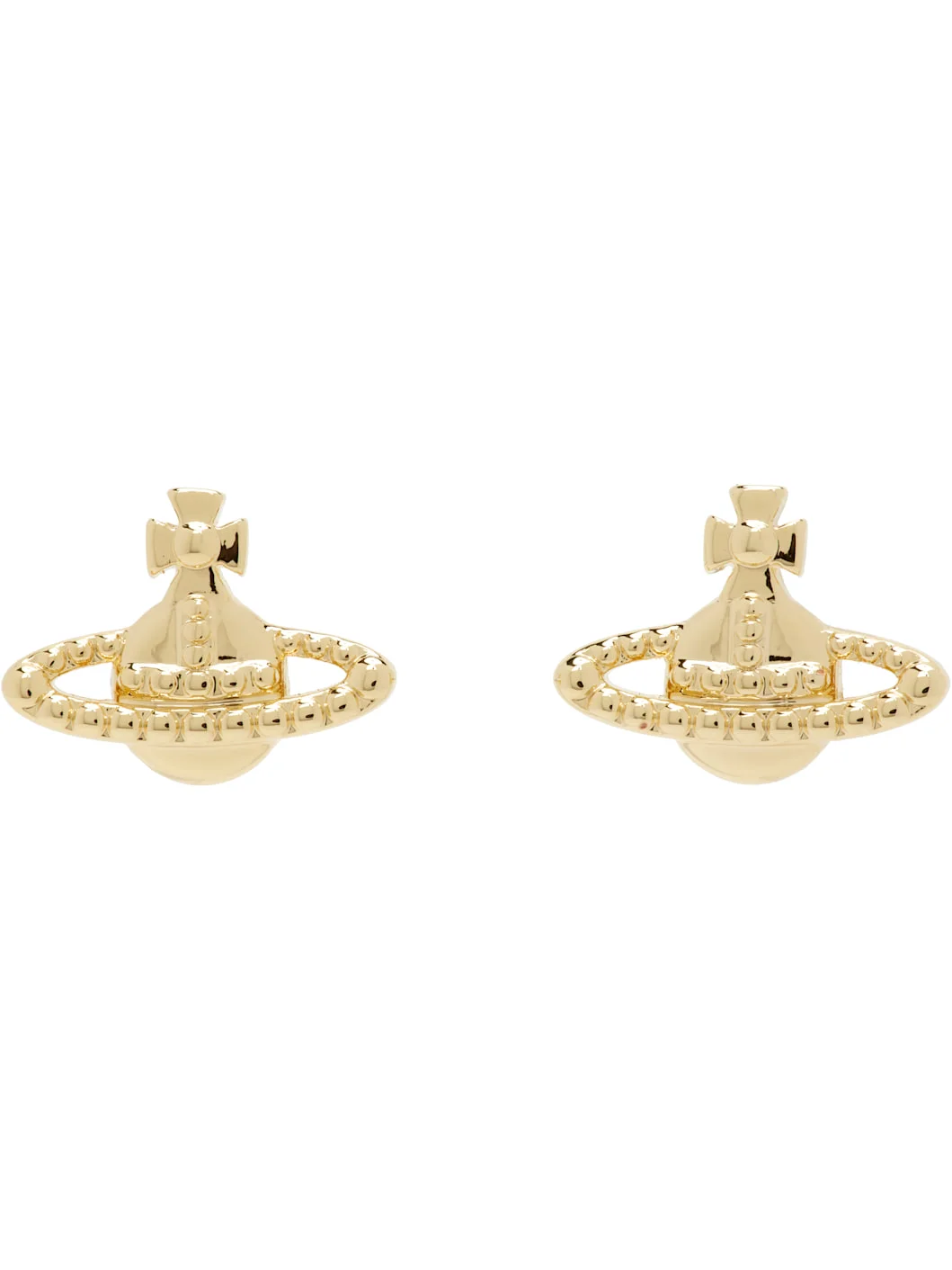 Pair of stud earrings in gold-tone brass. · Logo at face · Post-stud fastening · H0.25" x W0.5" Supplier color: Gold Brass. Made in Thailand 261314F022071