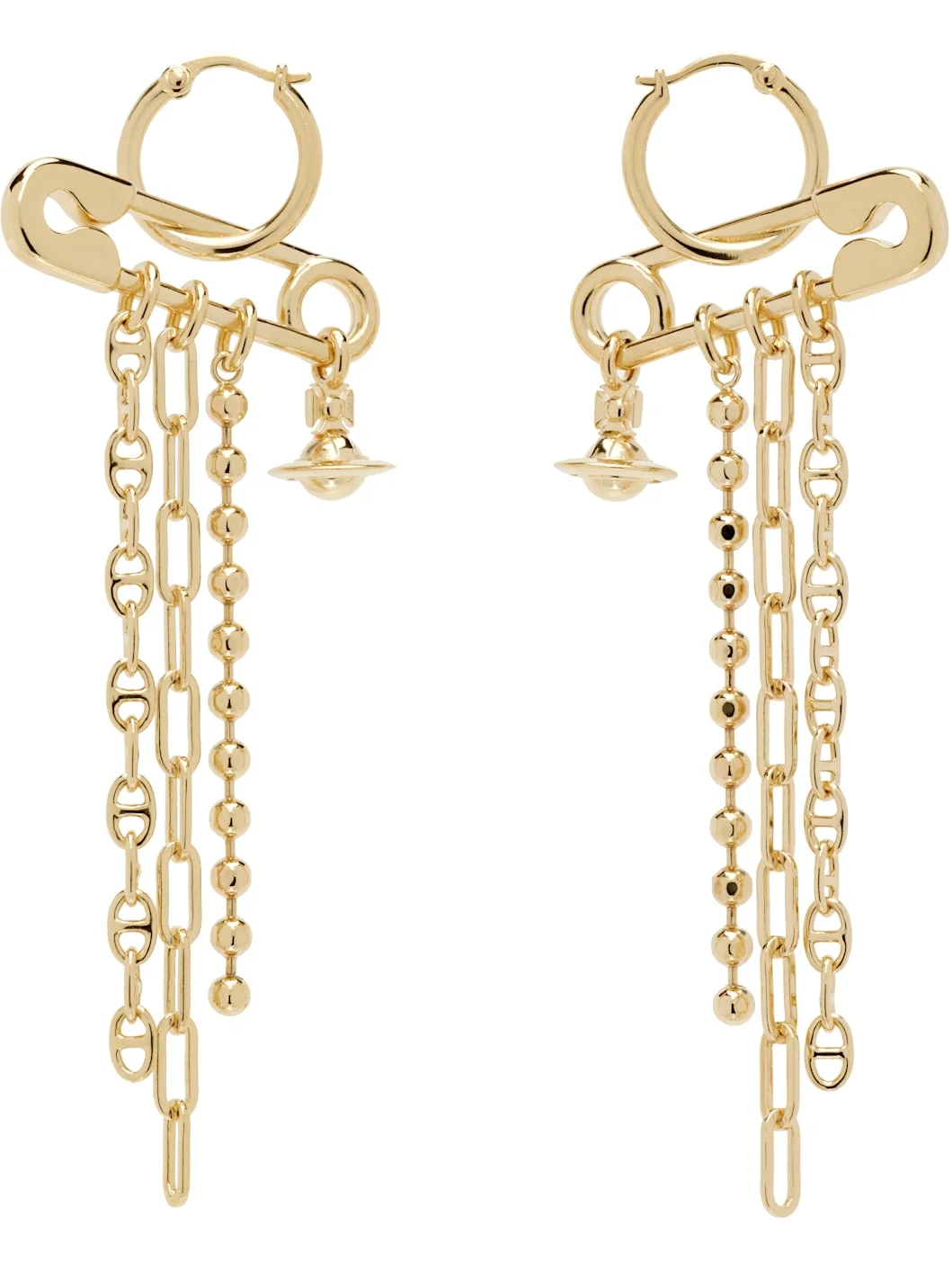 Pair of drop earrings in gold-tone brass. · Logo-engraved safety-pin charm · Logo pendant and assorted chains at drop · Hinged post fastening · H3.5" x W1.25" Supplier color: Gold Brass. Made in Thailand 252314F022010