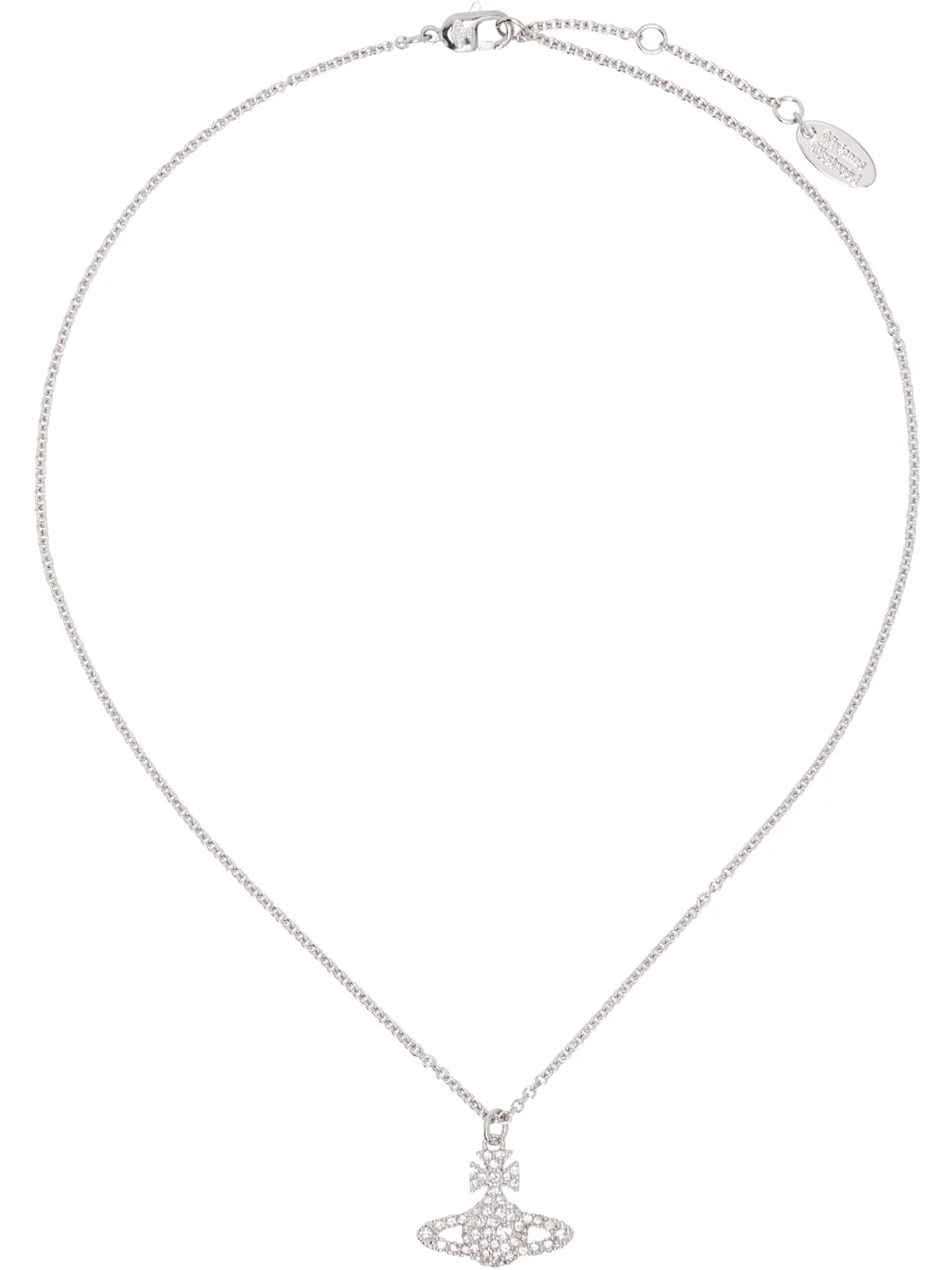 Cable chain necklace in silver-tone brass. · Logo pendant with pave-set crystals · Logo plaque at adjustable lobster-clasp fastening · L17" Supplier color: Platinum/Crystal Brass, crystal. Made in Thailand 252314M145037