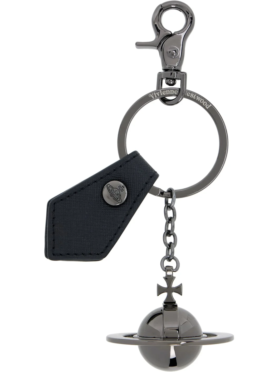 Keychain in gunmetal-tone. · Logo charm at drop · Saffiano faux-leather logo tab · Key ring and lobster-clasp fastening · Logo-engraved gunmetal-tone hardware · H6" x W2" x D2" Supplier color: Black saffiano Iron, synthetic. Made in Italy 252314M148003