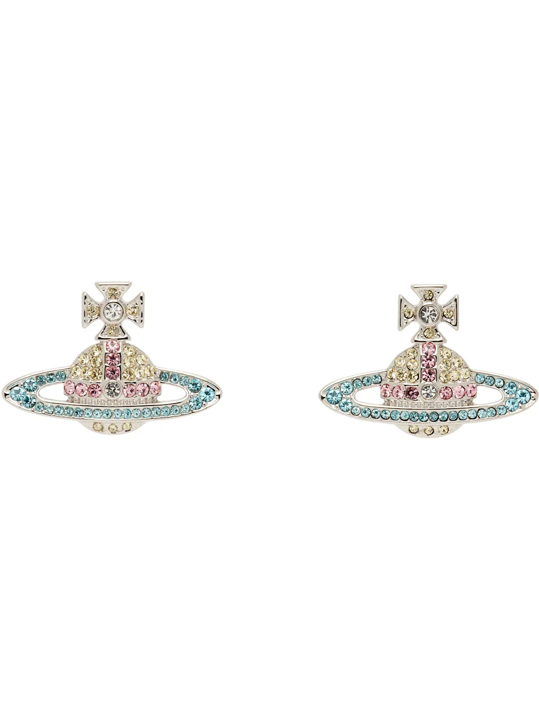 Pair of stud earrings in silver-tone brass. · Logo with pave-set crystals at face · Post-stud fastening · H0.75" x W1" Supplier color: Platinum/Jonquil/Aqua Brass. Made in Thailand 261314F022067
