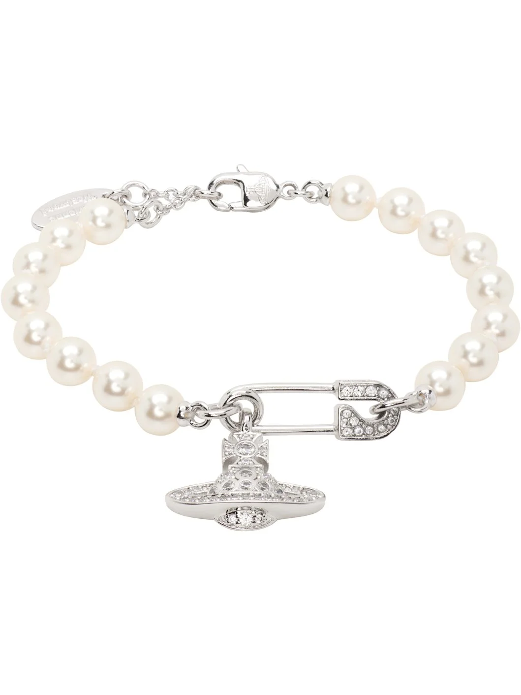 Beaded faux-pearl bracelet in white. · Safety pin and logo charm with pave-set glass crystals · Logo plaque at adjustable lobster-clasp fastening · L7.5" Supplier color: Platinum/Light Creamrose Pearl/White CZ Brass, glass. Made in Thailand 261314F020002