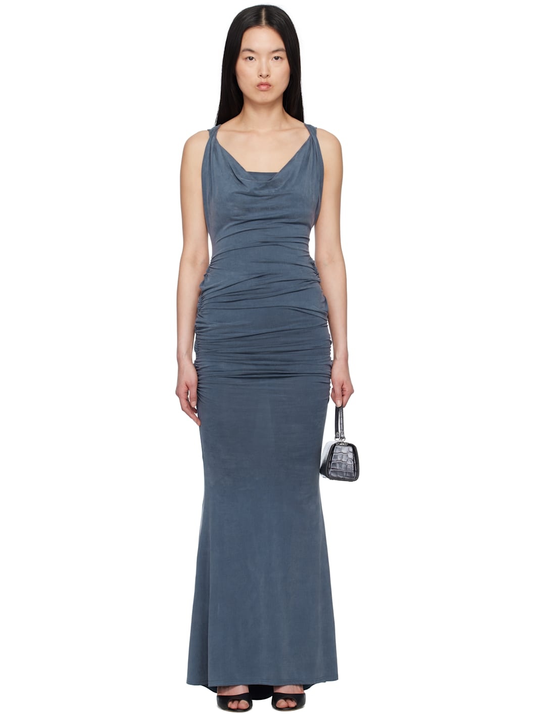Stretch cupro jersey maxi dress. · Cowl neck · Ruching at side seams Supplier color: Navy 94% cupro, 6% elastane. Made in Italy 251314F055012