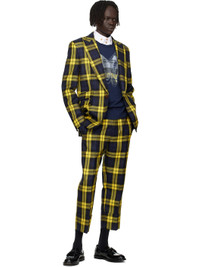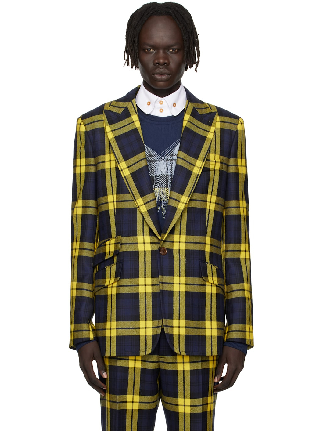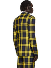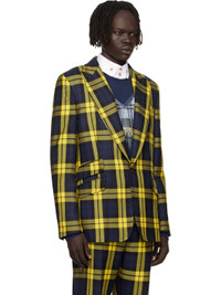 Virgin wool twill blazer. · Check pattern throughout · Peaked lapel · Single-button closure · Welt pocket and flap pockets · Padded shoulders · Three-button surgeon's cuffs · Twin vents at back hem · Welt pockets at interior · Logo-woven twill lining · Logo-engraved hardware Supplier color: Navy/Yellow Body: 100% virgin wool. Lining 1: 100% viscose. Lining 2: 100% cotton. Made in Italy 252314M195001
