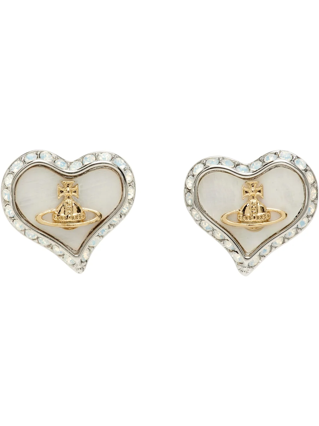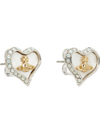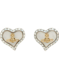 Pair of stud earrings in silver-tone brass. · Graphic with crystals and mother-of-pearl trim at face · Logo at face · Post-stud fastening · H0.5" x W0.5" Supplier color: Platinum/Gold/White pearl tint mop/White opal Brass, crystal, mother-of-pearl. Made in Thailand 261314F022066