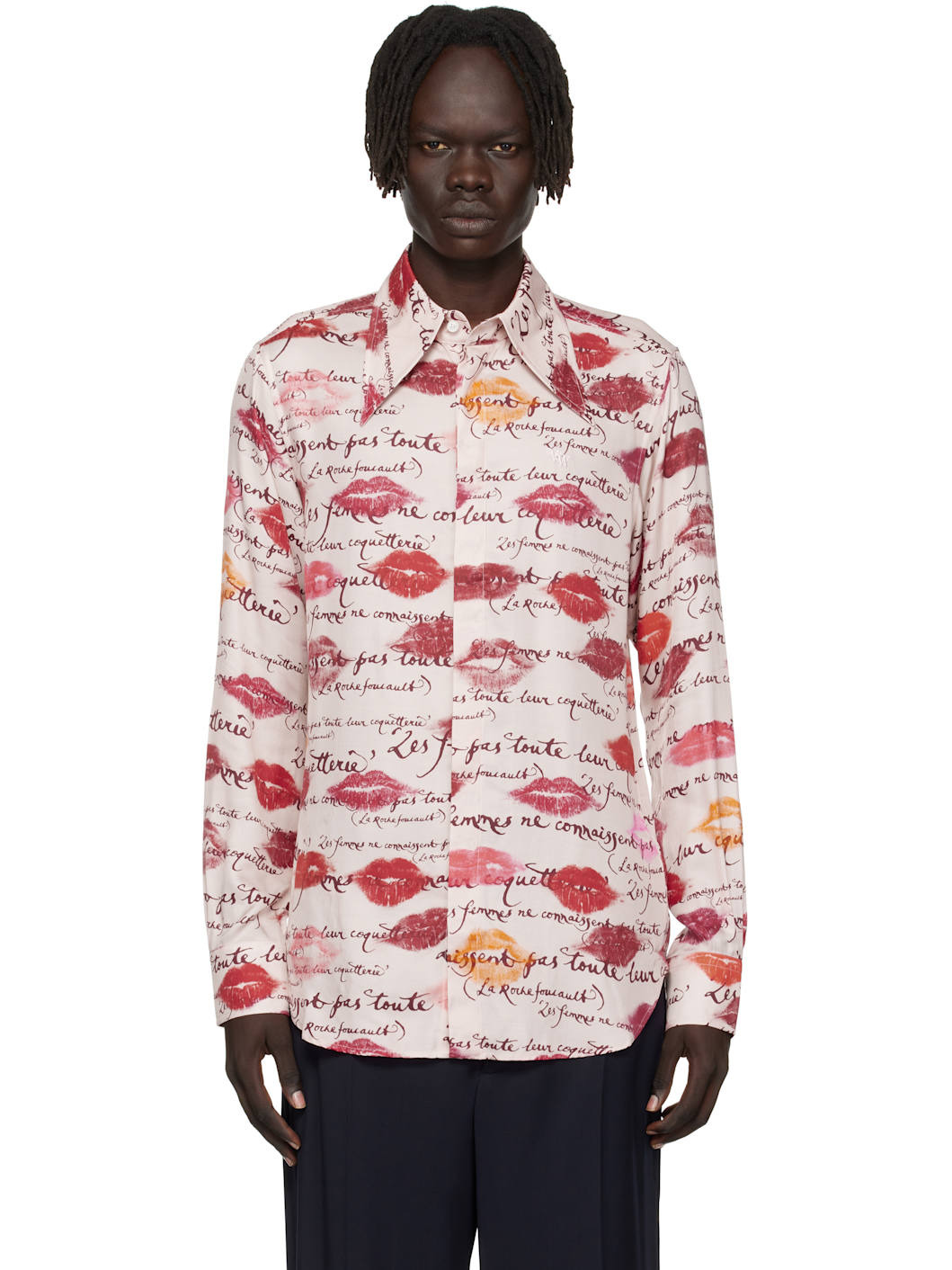 Viscose twill shirt. · Graphics and text printed throughout · Pointed collar · Button closure · Logo embroidered at chest · Shirttail hem · Single-button barrel cuffs · Twin pleats at back yoke · Mother-of-pearl hardware Supplier color: Kisses Body: 100% viscose. Trim: 80% viscose, 20% polyester. Made in Romania 252314M192007