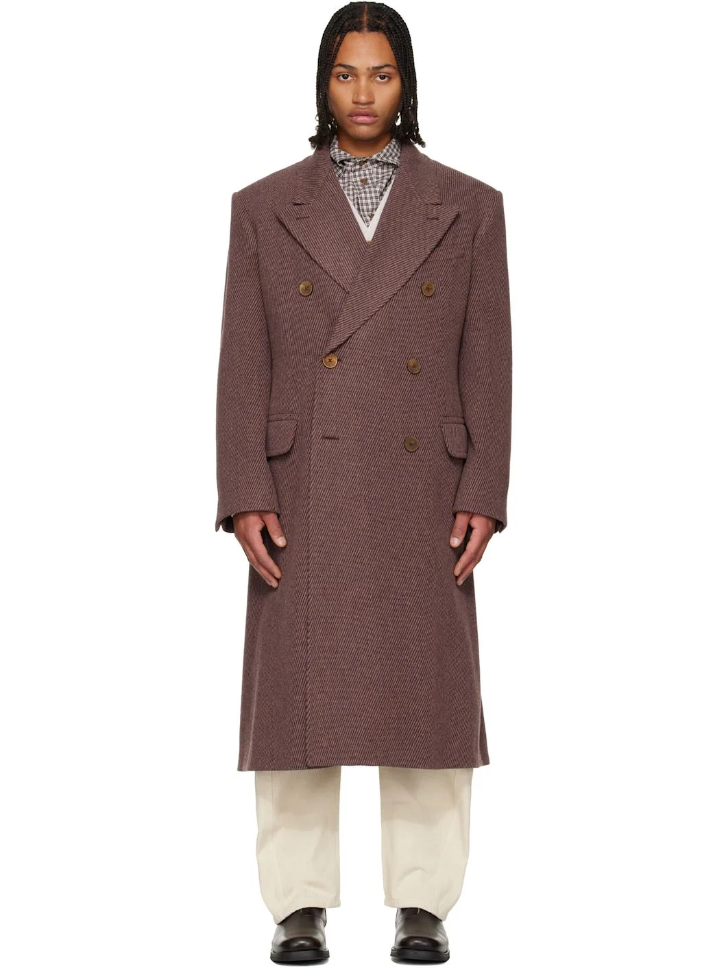 Wool twill coat. · Peaked lapel · Double-breasted button closure · Welt pocket at chest · Flap pockets at waist · Padded shoulders · Surgeon's cuffs · Central vent at back hem · Welt pockets at interior · Full logo-woven satin lining Supplier color: Plum Body: 100% wool. Trim: 100% cotton. Lining: 100% viscose. Made in Italy 252314M176002