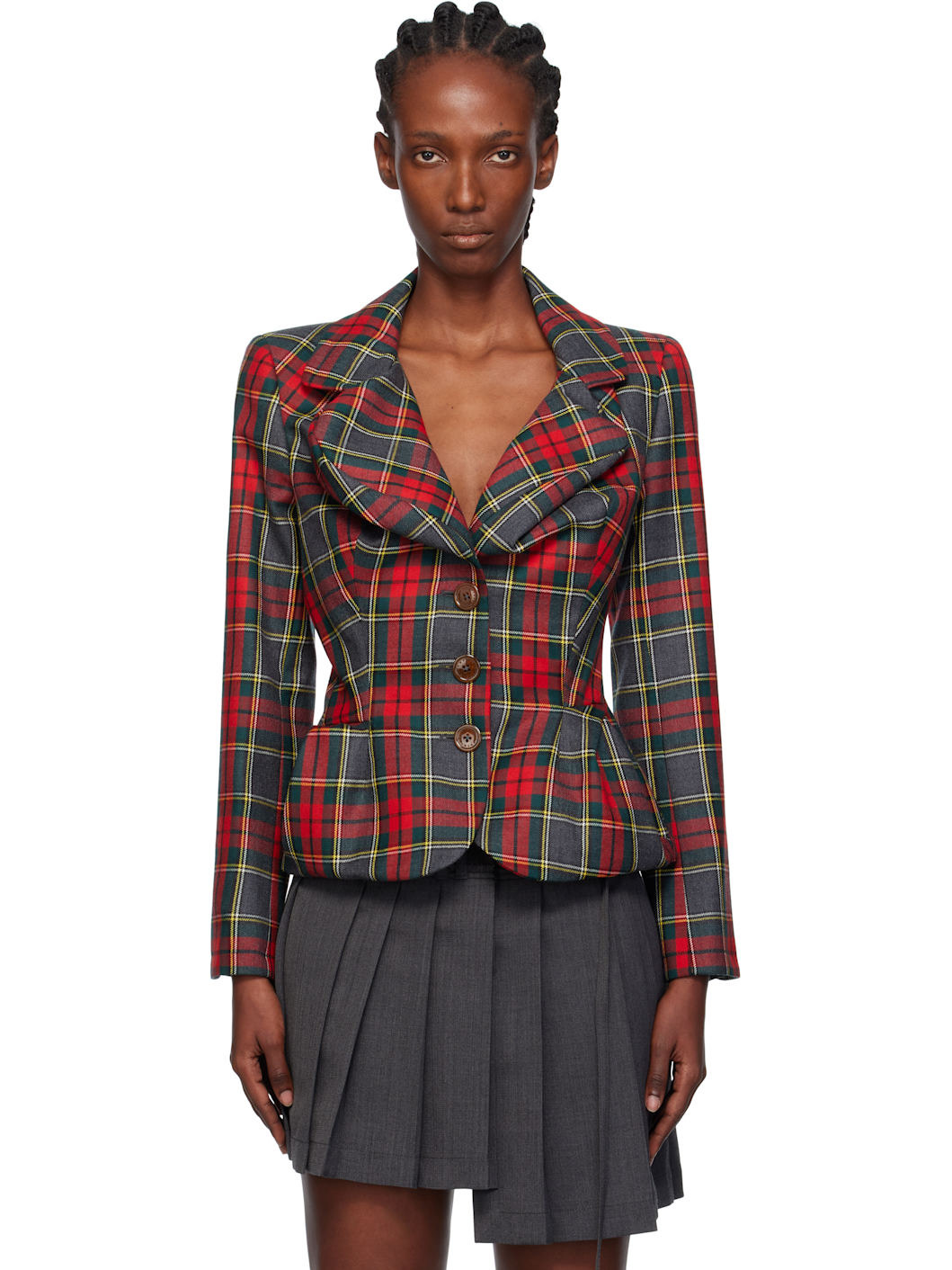 Virgin wool serge blazer. · Asymmetrical construction · Check pattern and draping throughout · Modified notched lapel · Button closure · Welt pockets at waist · Buttoned surgeon's cuffs · Central vent at back hem · Logo-woven twill lining Supplier color: Red/Green Body: 100% virgin wool. Lining: 100% viscose. Pocket lining: 100% cotton. Made in Italy 252314F057005