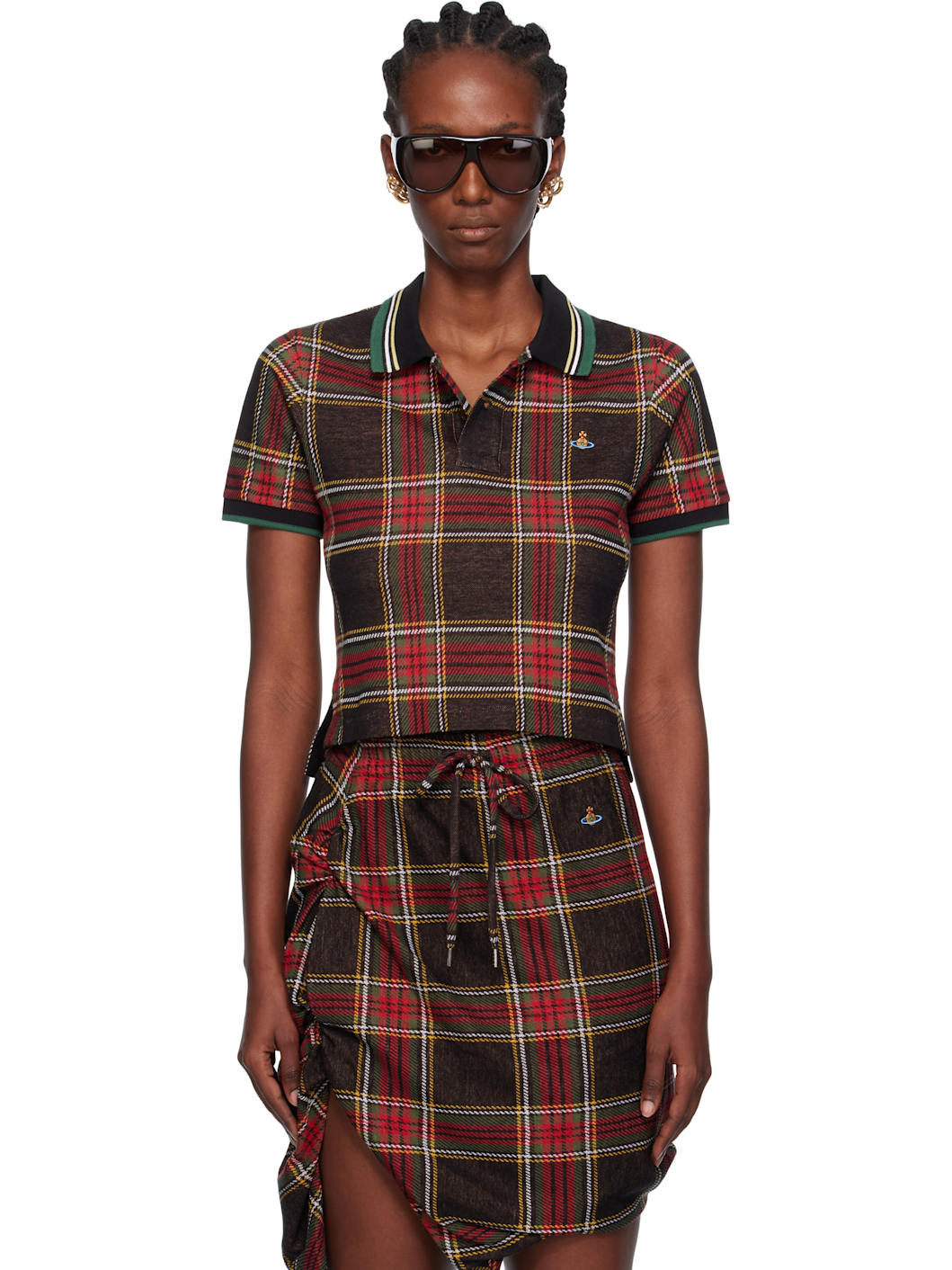 Organic cotton flannel polo. · Jacquard check pattern throughout · Striped rib-knit spread collar and cuffs · Two-button placket · Embroidered logo at chest · Cropped tennis-tail hem Supplier color: Red/Green 100% organic cotton. Made in Turkey 252314F108000