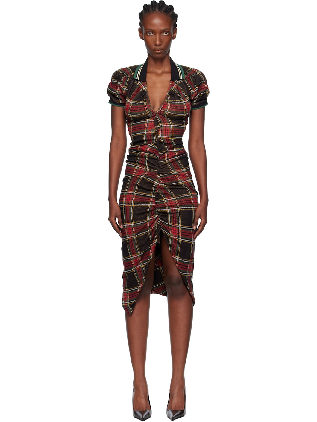 Knit organic cotton midi dress. · Check pattern throughout · Rib-knit spread collar and cuffs · Keyhole with button fastening at front · Embroidered logo at chest · Central vent at front hem · Puff sleeves Supplier color: Red/Green Body: 100% organic cotton. Trim: 100% cotton. Made in Turkey 252314F054003