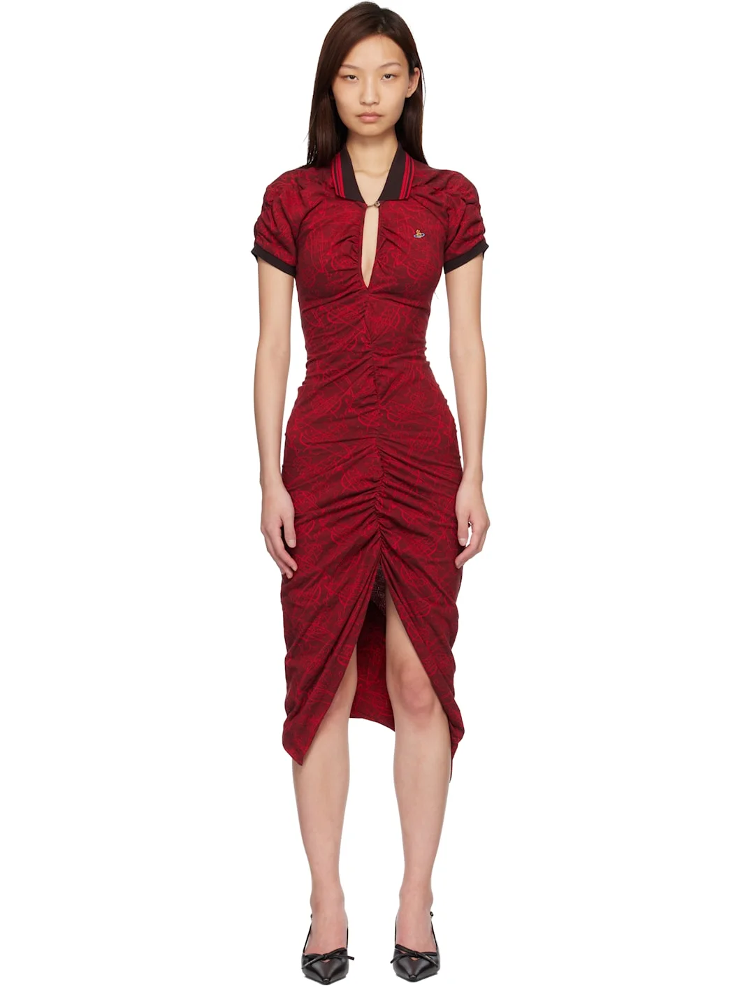 Organic cotton pique midi dress. · Jacquard logo pattern and ruching throughout · Stripes at rib-knit spread collar · Keyhole button fastening at front · Logo embroidered at chest · Central vent at front hem · Puff sleeves · Rib-knit cuffs Supplier color: Graffiti Orbs 100% cotton. Made in Turkey 261314F054016