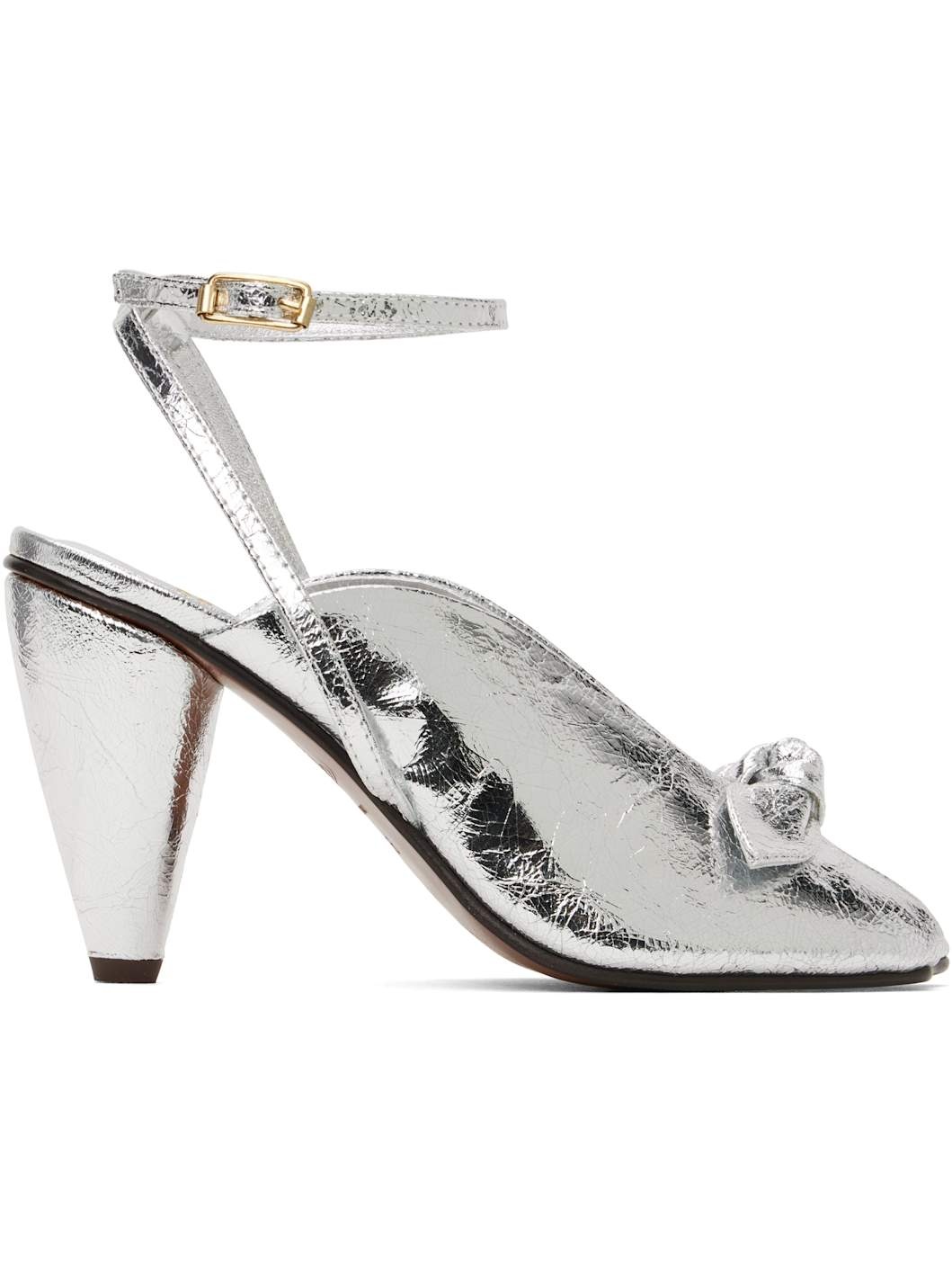 Foil-coated crinkled leather heels in silver tone. · Cutout at square toe · Bow accent at vamp · Pin-buckle ankle strap · Logo printed at padded footbed · Buffed leather lining · Covered cone heel with rubber injection · Polished leather sole · Heel: H3.5" Supplier color: Silver Upper: leather. Sole: leather, rubber. Made in Italy 251314F122000