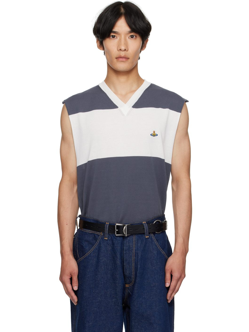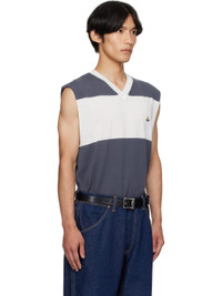 Lightweight knit organic Mako cotton sweater vest. · Stripes throughout · Rib-knit V-neck and hem · Embroidered logo at chest · Rolled edge at armscyes Supplier color: Blue grey 100% organic cotton. Made in Italy 251314M206003