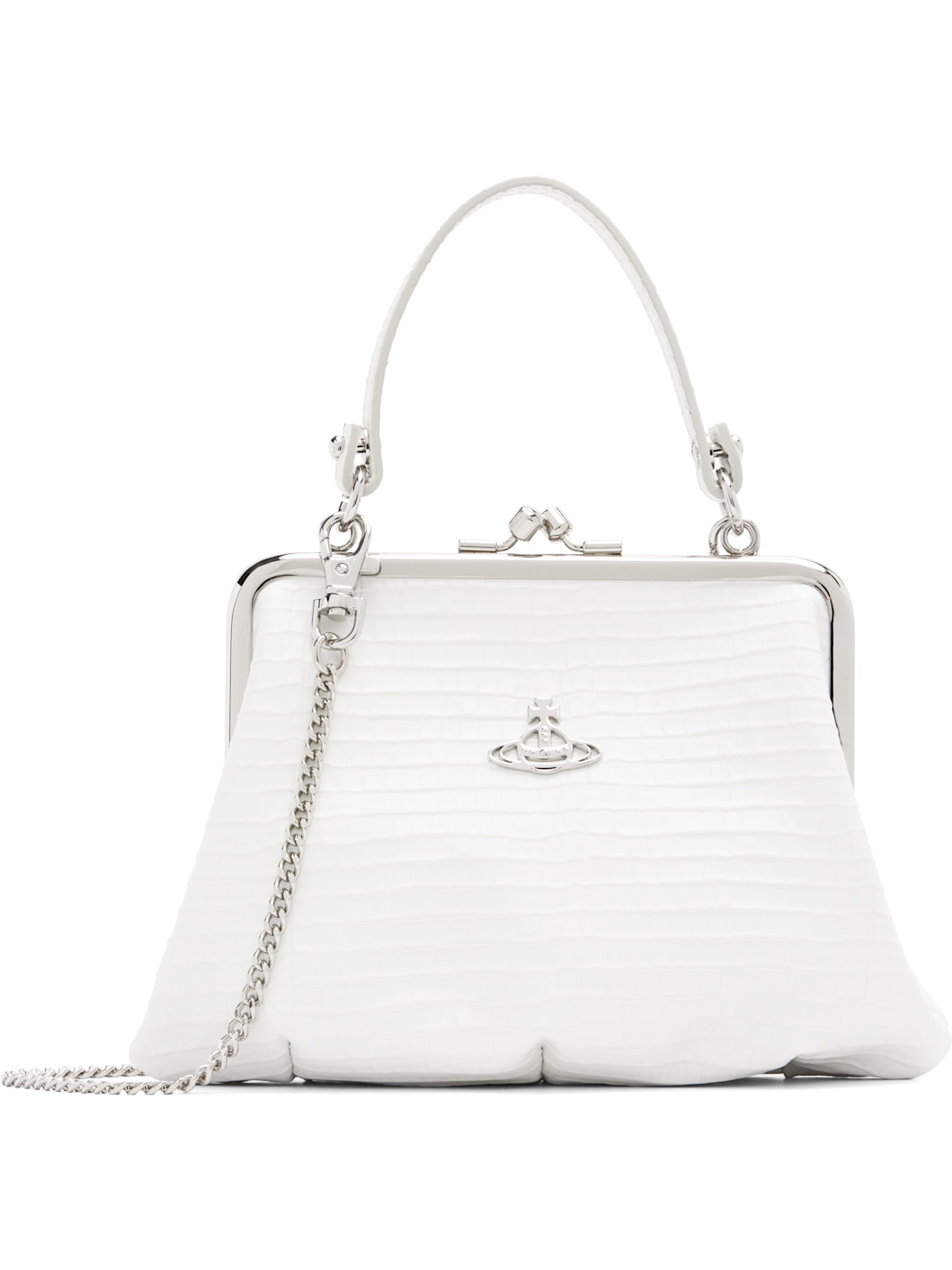 Croc-embossed calfskin top handle bag. · Detachable carry handle · Detachable curb chain crossbody strap · Logo hardware at face · Kiss-lock closure · Zip pocket at interior · Faille lining · H6" x W8.5" x D4" Supplier color: White Calfskin. Made in Italy 252314F046016