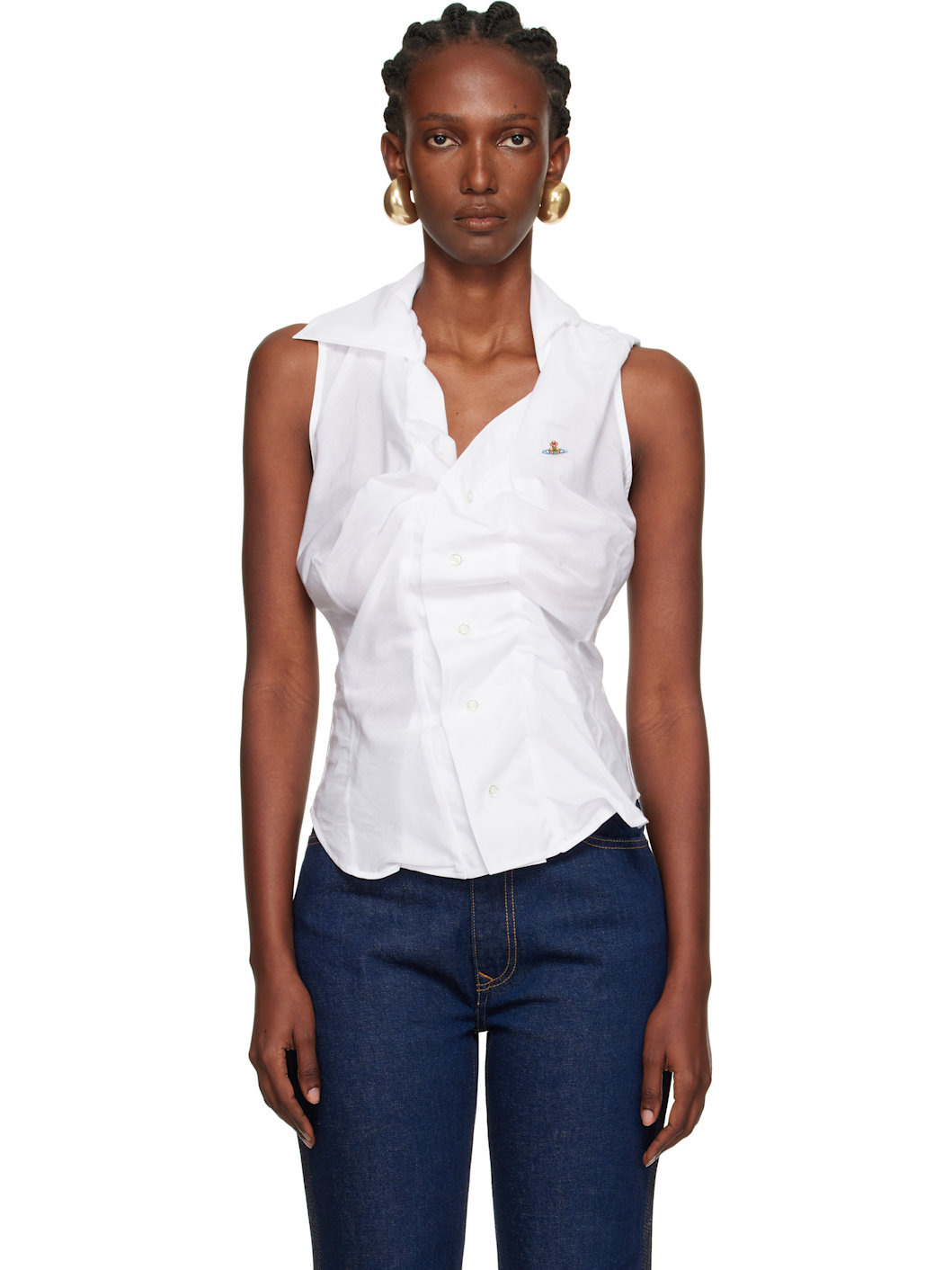 Cotton- and silk-blend voile shirt. · Gathering throughout · Asymmetrical construction · Modified spread collar · Button closure · Logo embroidered at chest · Darts at front and back · Shirttail hem · Logo-engraved mother-of-pearl hardware Supplier color: White Body: 70% cotton, 30% silk. Trim: 70% viscose, 30% polyester. Made in Romania 251314F109016