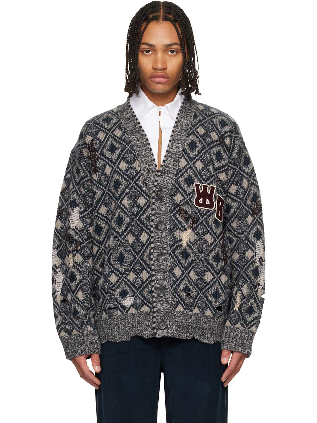 Oversized knit merino wool cardigan. · Distressing, laddering, and graphic pattern throughout · Rib-knit Y-neck, hem, and cuffs · Chenille logo patch at chest · Dropped shoulders · Logo-engraved hardware Supplier color: Grey/Black/Navy 100% merino wool. Made in Italy 252752M200000