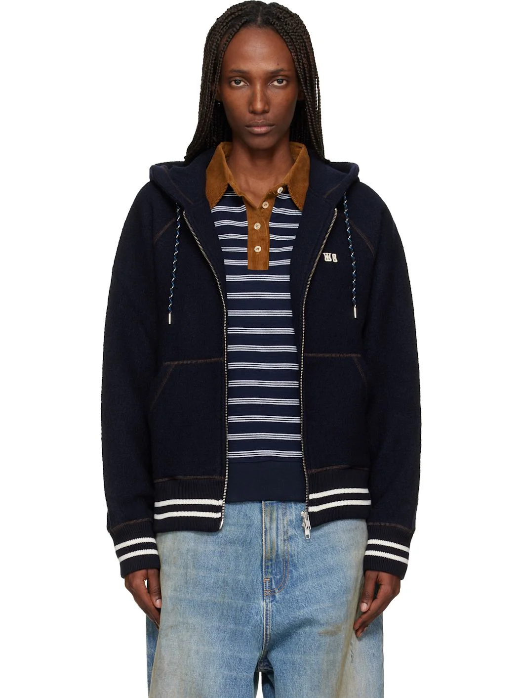 Virgin wool boucle hoodie. · Drawstring at hood · Two-way zip closure · Logo embroidered at chest · Patch pockets at front · Striped rib-knit hem and cuffs · Raglan sleeves · Contrast stitching in brown Supplier color: Navy 100% virgin wool. Made in Portugal 252752F097006