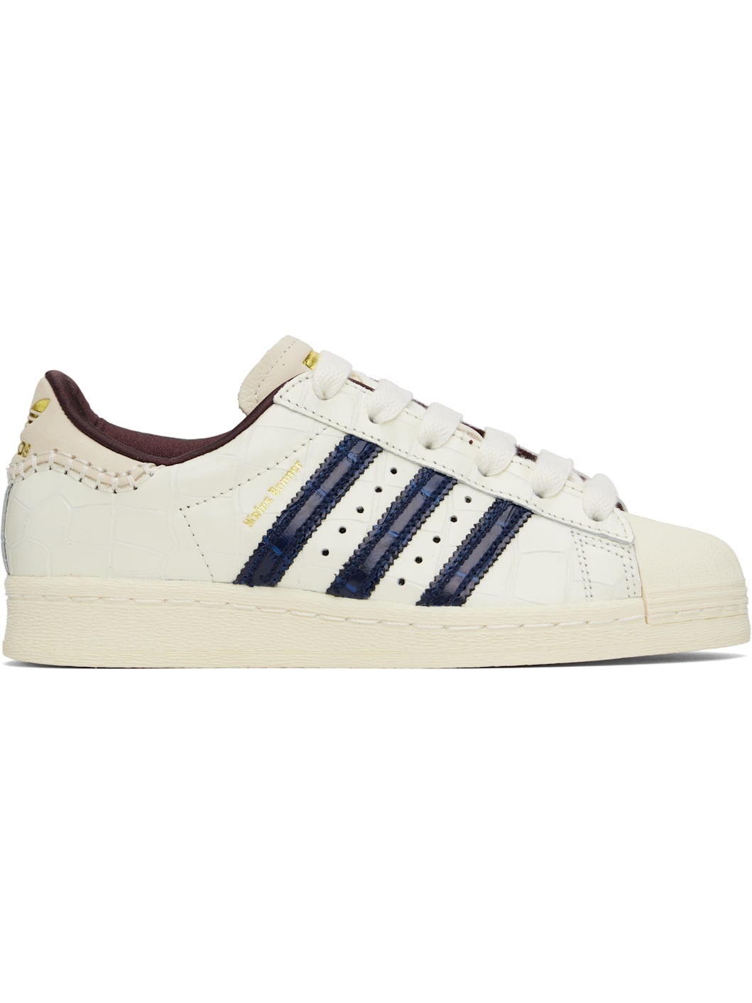 Low-top croc-embossed leather sneakers in white. · Textured rubber cap toe · Lace-up closure · Logo embossed at padded suede tongue · Padded collar · Serrated signature stripes and perforations at sides · Logo stamp at outer side · Blanket stitching and logo embossed at suede heel tab · Satin lining · Treaded rubber sole Part of the Wales Bonner x adidas Originals collaboration. Supplier color: Wonder white/Collegiate navy/Night red Upper: leather. Sole: rubber. Made in Indonesia 251752M237000