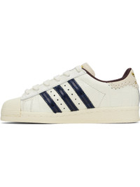 Low-top croc-embossed leather sneakers in white. · Textured rubber cap toe · Lace-up closure · Logo embossed at padded suede tongue · Padded collar · Serrated signature stripes and perforations at sides · Logo stamp at outer side · Blanket stitching and logo embossed at suede heel tab · Satin lining · Treaded rubber sole Part of the Wales Bonner x adidas Originals collaboration. Supplier color: Wonder white/Collegiate navy/Night red Upper: leather. Sole: rubber. Made in Indonesia 251752F128000