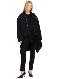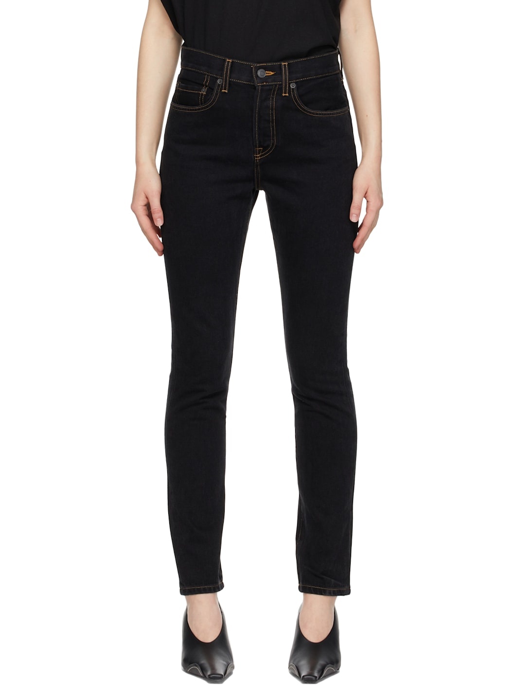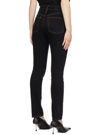 Tapered denim jeans in black. · High-rise · Five-pocket styling · Belt loops at waistband · Button-fly · Bronze-tone and black hardware Supplier color: Black 100% cotton. Made in United States 221277F069001