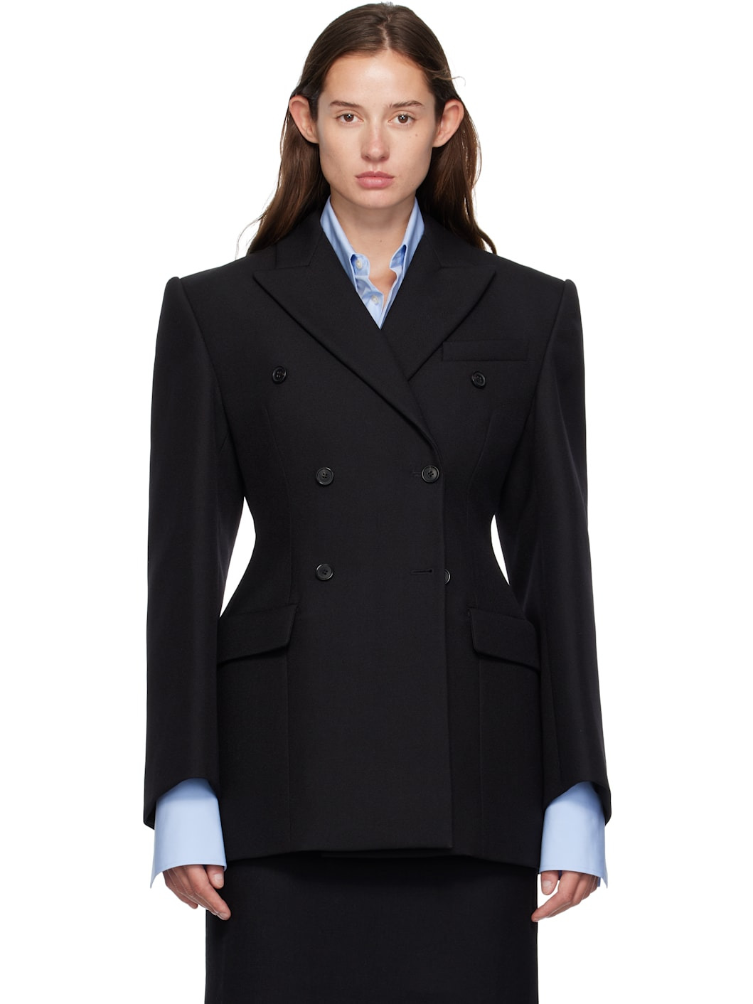 Heavyweight woven virgin wool blazer. · Peaked lapel · Double-breasted button closure · Darts at front · Flap pockets at waist · Padded shoulders · Buttoned surgeon's cuffs · Buttoned pocket at interior · Full satin lining Supplier color: Black Body: 100% virgin wool. Lining: 100% viscose. Made in Slovakia (Slovak Republic) 252277F057005