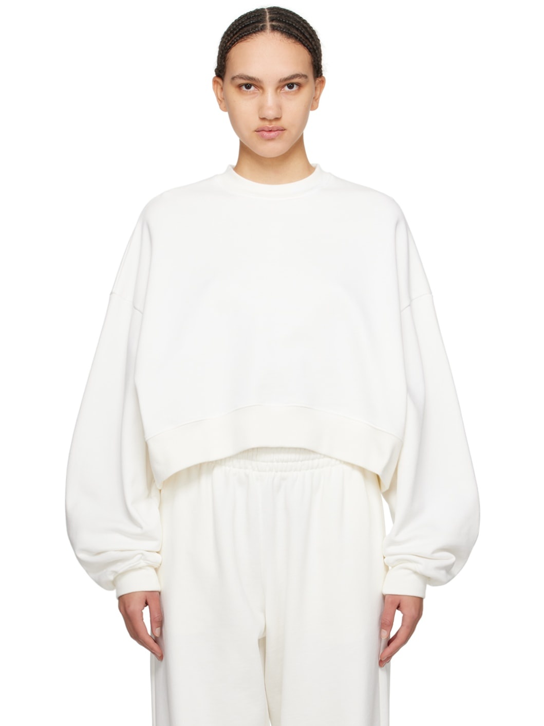 French terry sweatshirt. · Rib knit crewneck, hem, and cuffs · Cropped hem · Dropped shoulders Part of the WARDROBE.NYC x Hailey Bieber collaboration. Supplier color: Off white 100% cotton. Made in Portugal 241277F098002