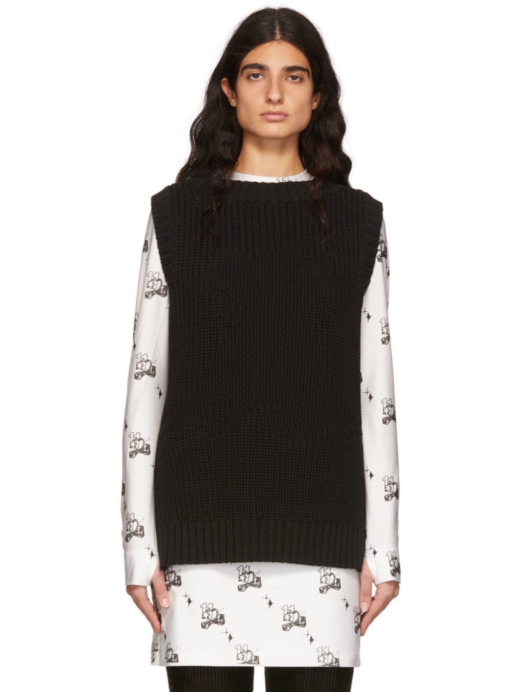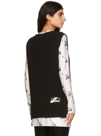 Rib knit and seed stitch knit cotton vest. · Jacquard graphic at front · Vented side-seams · Rib knit crewneck, armscyes, and hem Supplier color: Black 100% cotton.