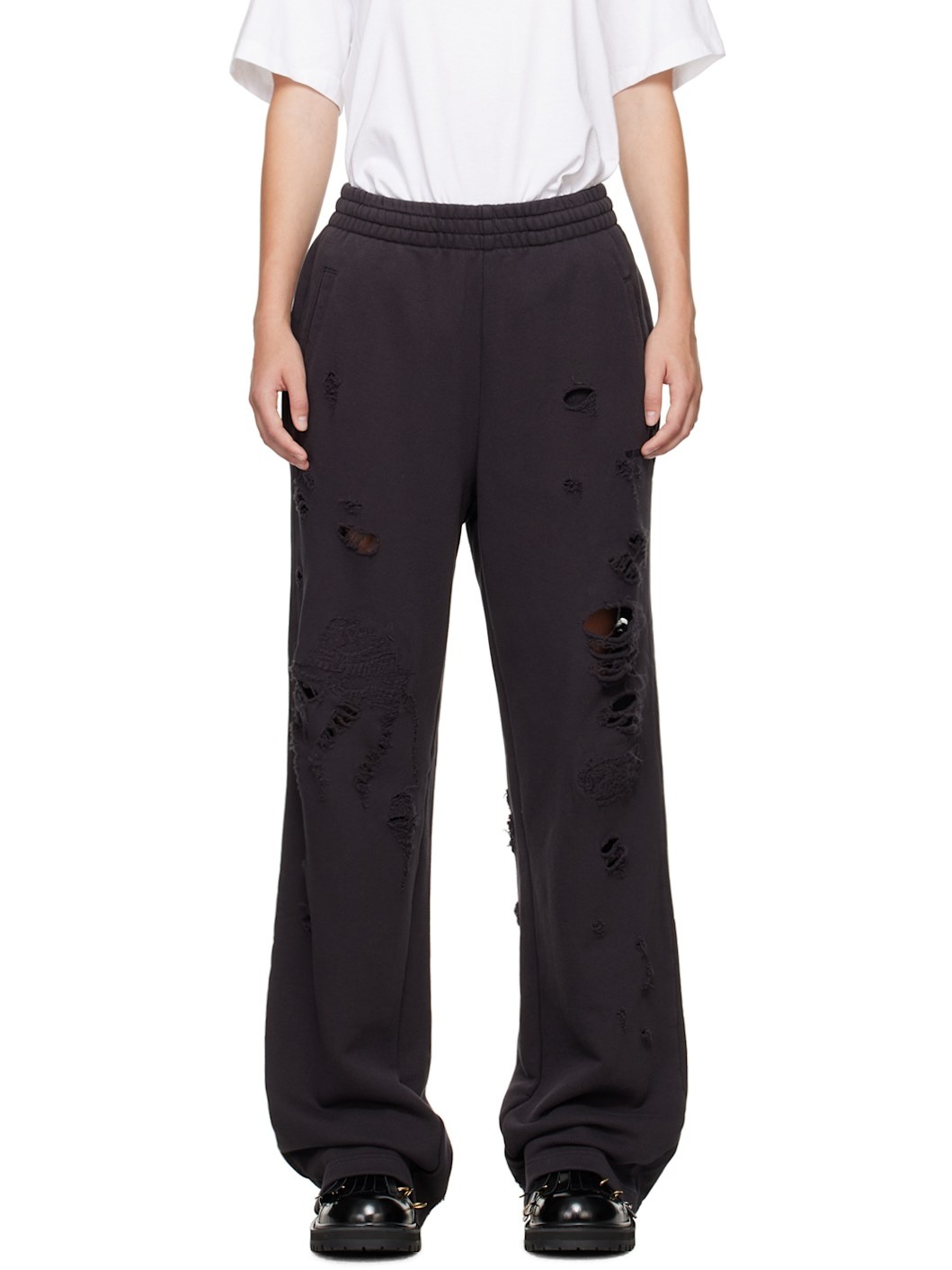 Loose-fit French terry sweatpants. Distressing throughout. · Concealing drawstring at elasticized waistband · Two-pocket styling · Logo embroidered at front leg Supplier color: Black 100% cotton. Made in South Korea 242327F087000