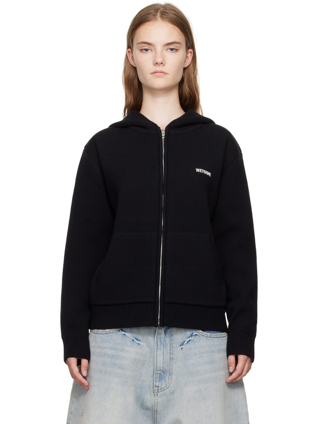 Knit wool- and cotton-blend hoodie. · Zip closure · Logo embroidered at chest · Patch pockets · Rib knit hem and cuffs · Logo-engraved silver-tone hardware Supplier color: Black 77% wool, 23% cotton. Made in South Korea 242327F097015