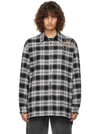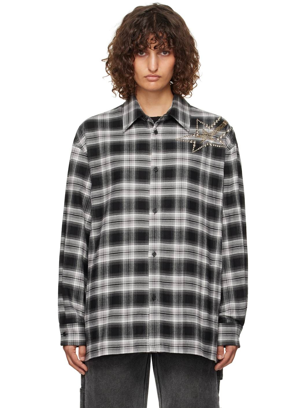 Cotton flannel shirt. Check pattern throughout. · Spread collar · Button closure · Welt pockets · Studded graphic at shoulder · Single-button barrel cuffs · Embroidered logo at back hem · Gold-tone and silver-tone hardware Supplier color: Black 100% cotton. Made in South Korea 242327F109003