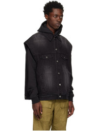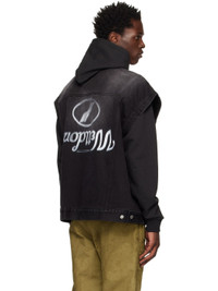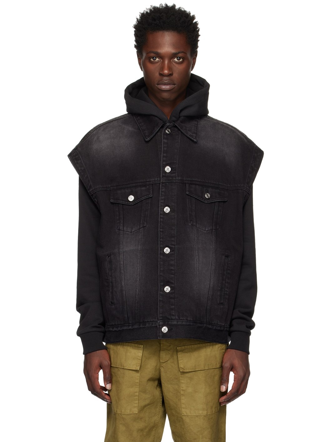 Non-stretch denim vest. Fading throughout. · Spread collar · Button closure · Flap pockets at chest · Welt pockets at waist · Logo graphic printed at back · Adjustable buttoned tabs at back hem Supplier color: Black 100% cotton. Made in South Korea 222327M185000