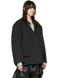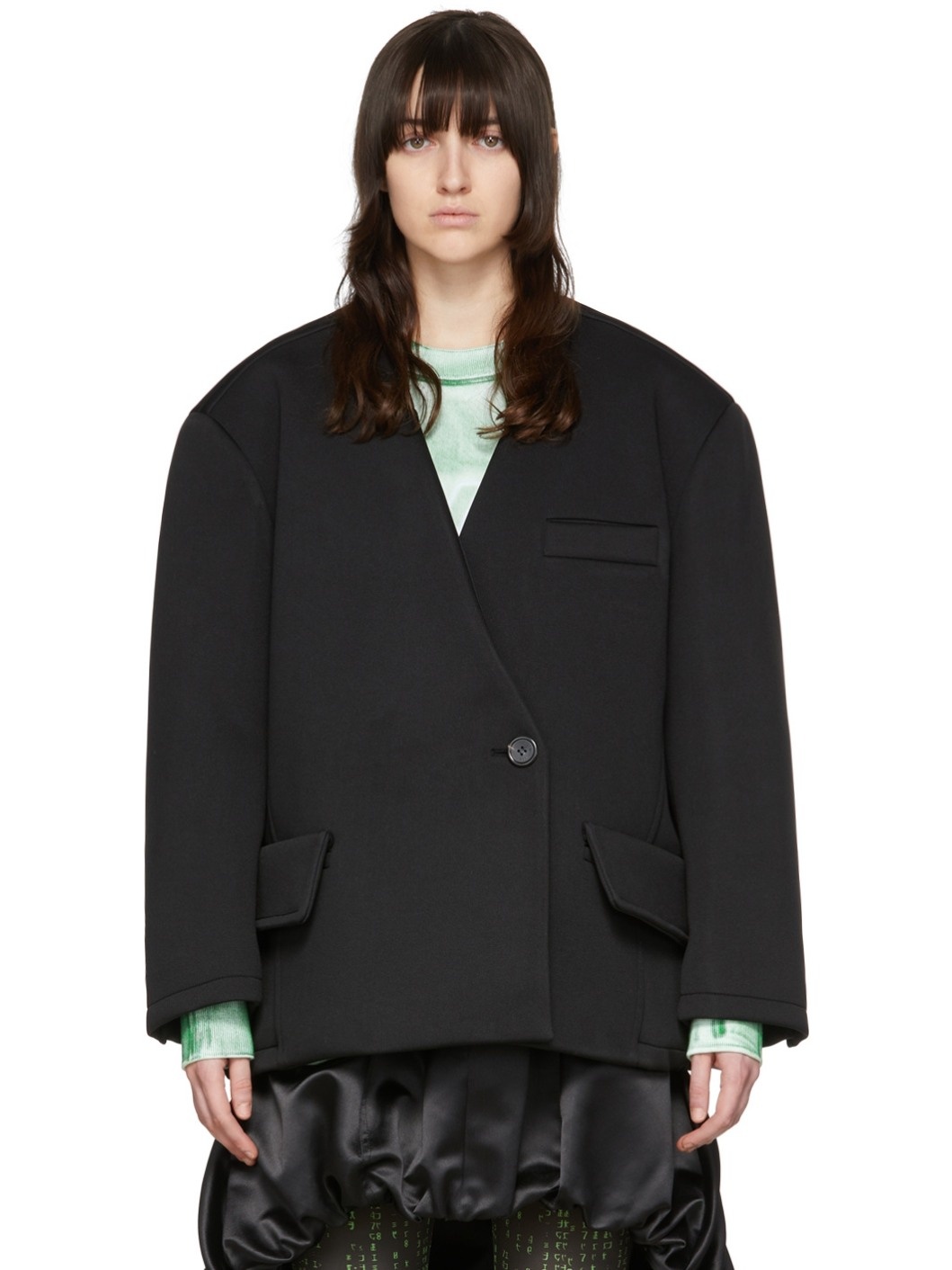 Paneled polyester bonded jersey blazer. · Inset spread collar · Button closure · Welt pocket and flap pockets · Vent at cuffs · Bungee-style drawstring at elasticized hem · Welt pocket at interior · Partially lined Supplier color: Black Body: 100% polyester. Lining: 100% polyester.