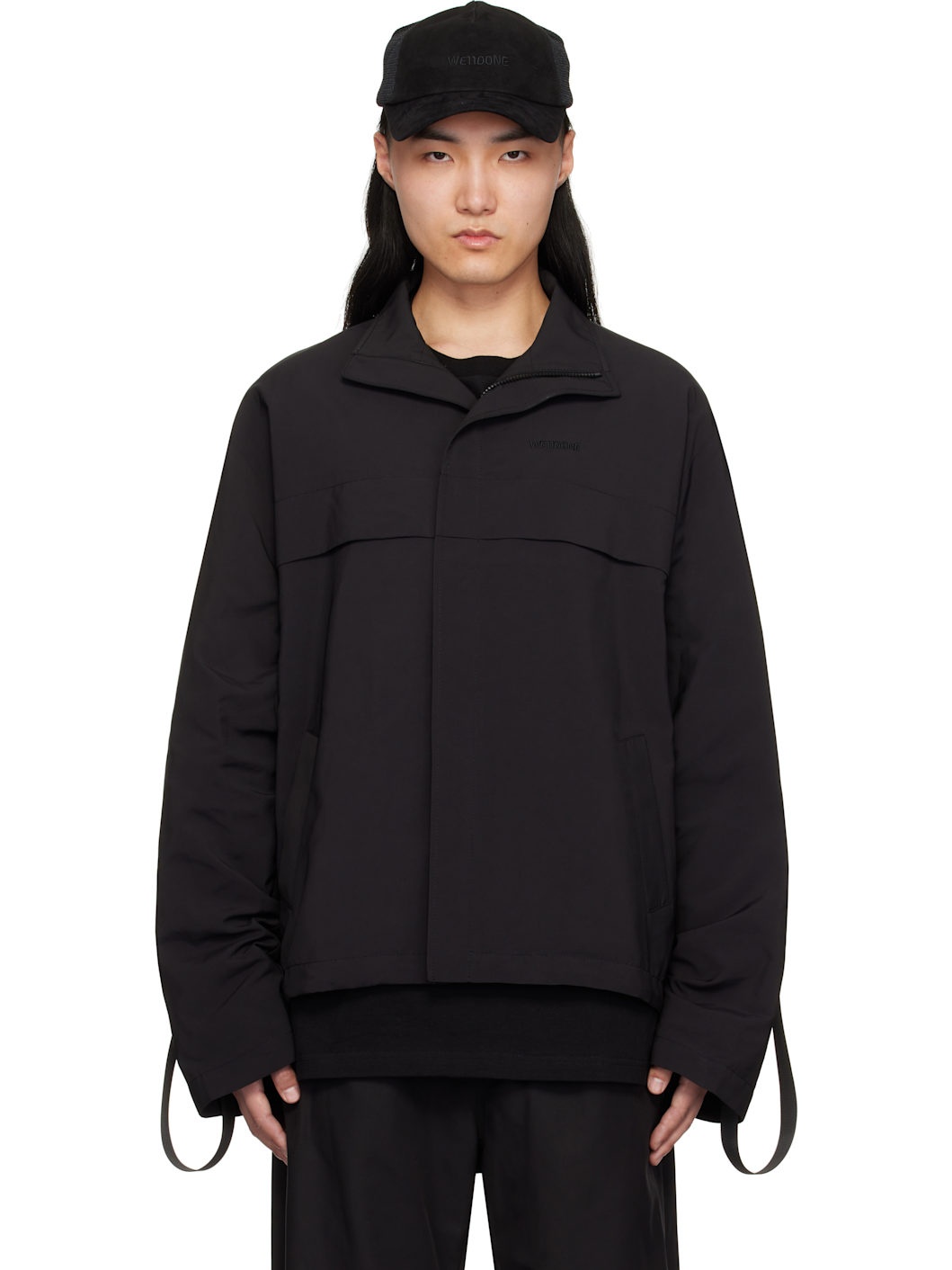 Plain-woven polyester-blend jacket. · Stand collar · Concealed zip closure · Logo embroidered at chest · Storm flap at front and back · Welt pockets · Concealed bungee-style drawstring at hem · Dropped shoulders · Press-release strap at sleeves · Welt pockets at interior · Full mesh lining Supplier color: Black Body: 91% polyester, 9% nylon. Lining: 100% polyester. Made in South Korea 251327M180009