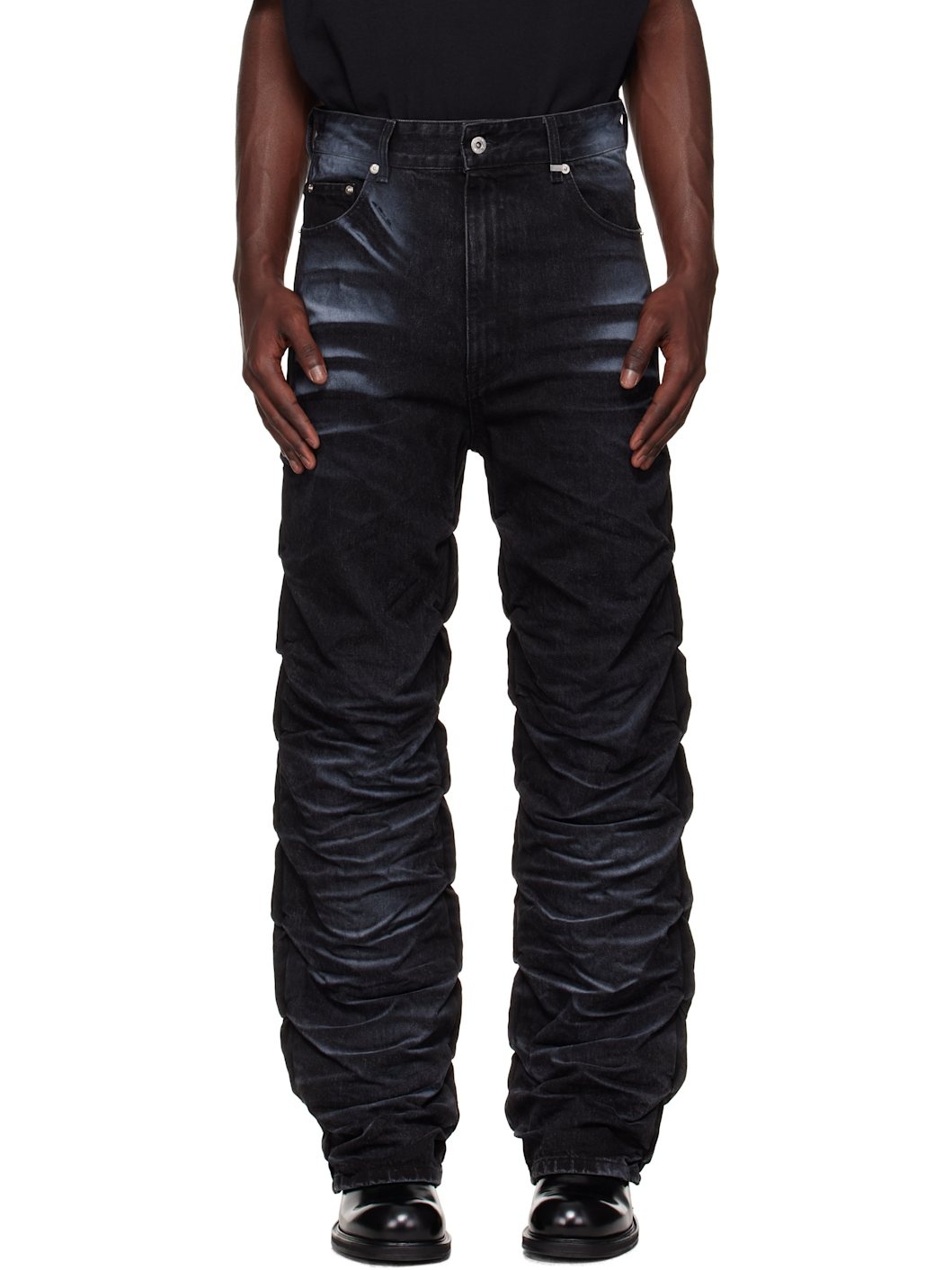 Non-stretch denim jeans. Fading and whiskering throughout. · Belt loops · Five-pocket styling · Zip fly · Logo patch at back waistband · Ruching at outseams · Stacking at legs Supplier color: Black 100% cotton. Made in South Korea 252327M186000