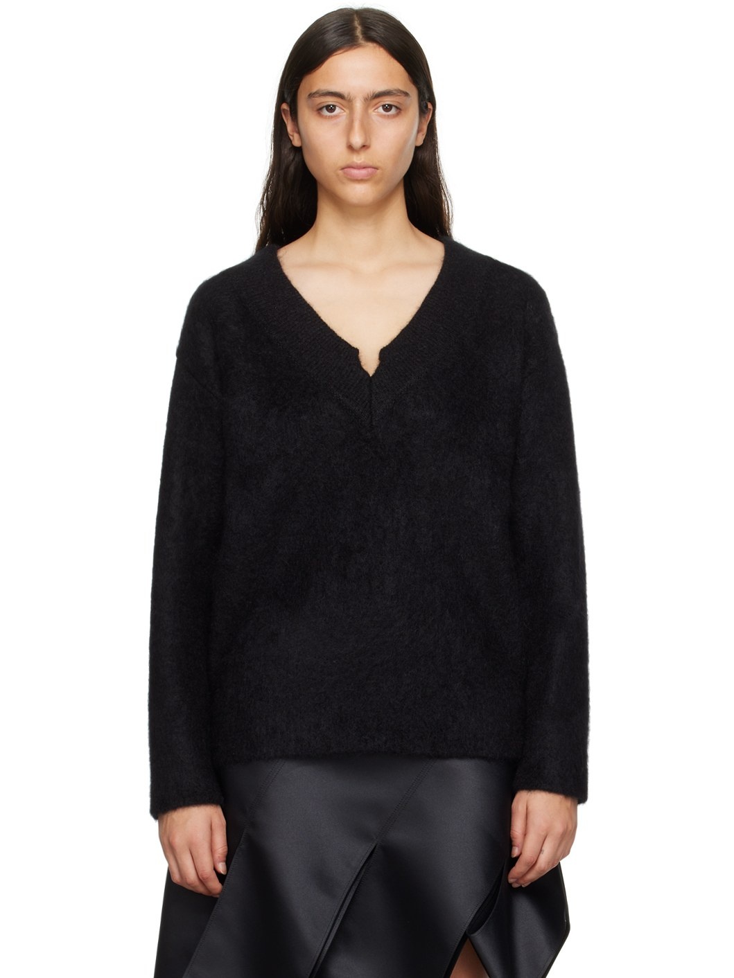 Knit mohair-blend sweater. Rib knit V-neck, hem, and cuffs Supplier color: Black