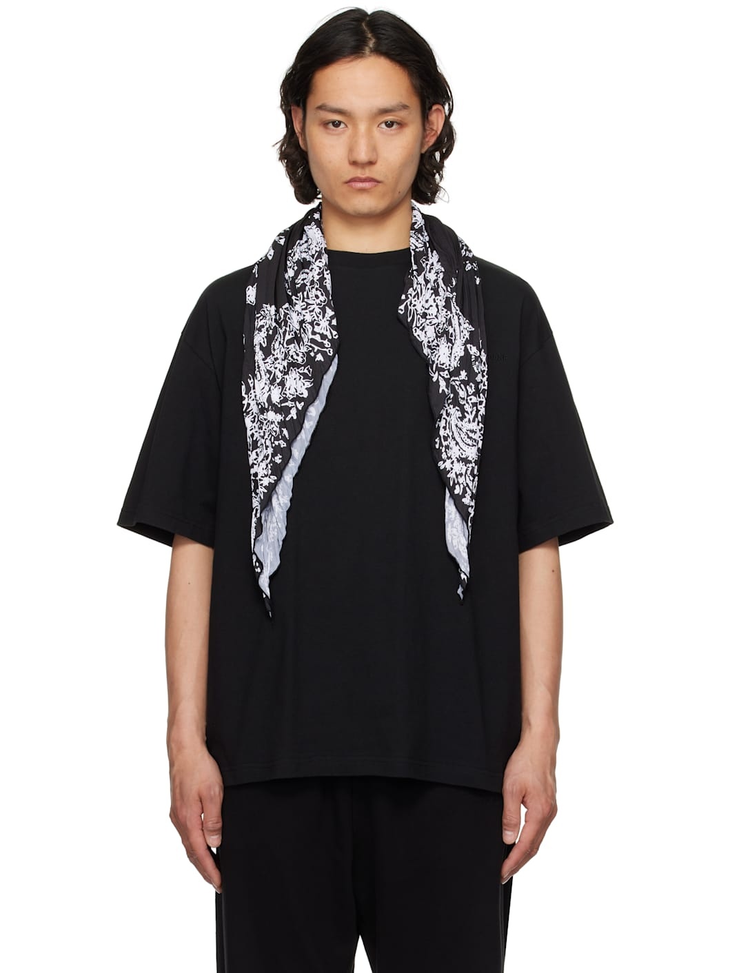 Cotton jersey T-shirt. · Rib-knit crewneck · Dropped shoulders · Printed graphic pattern at integrated polyester satin scarf Supplier color: Black Body: 100% cotton. Trim 1: 100% polyester. Trim 2: 95% cotton, 5% polyurethane. Made in South Korea 251327M213063