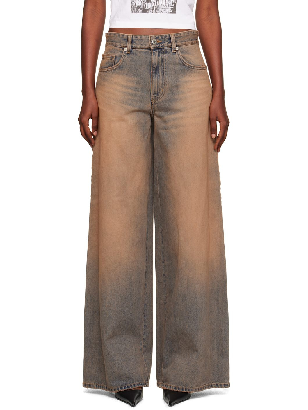Non-stretch denim jeans. · Discoloration, whiskering, and subtle distressing throughout · Wide-leg · Mid-rise · Belt loops · Five-pocket styling · Zip fly · Grosgrain trim at outseams · Jacron logo patch at back waistband · Logo embroidered at back pocket Supplier color: Beige 100% cotton. Made in South Korea 252327F069000