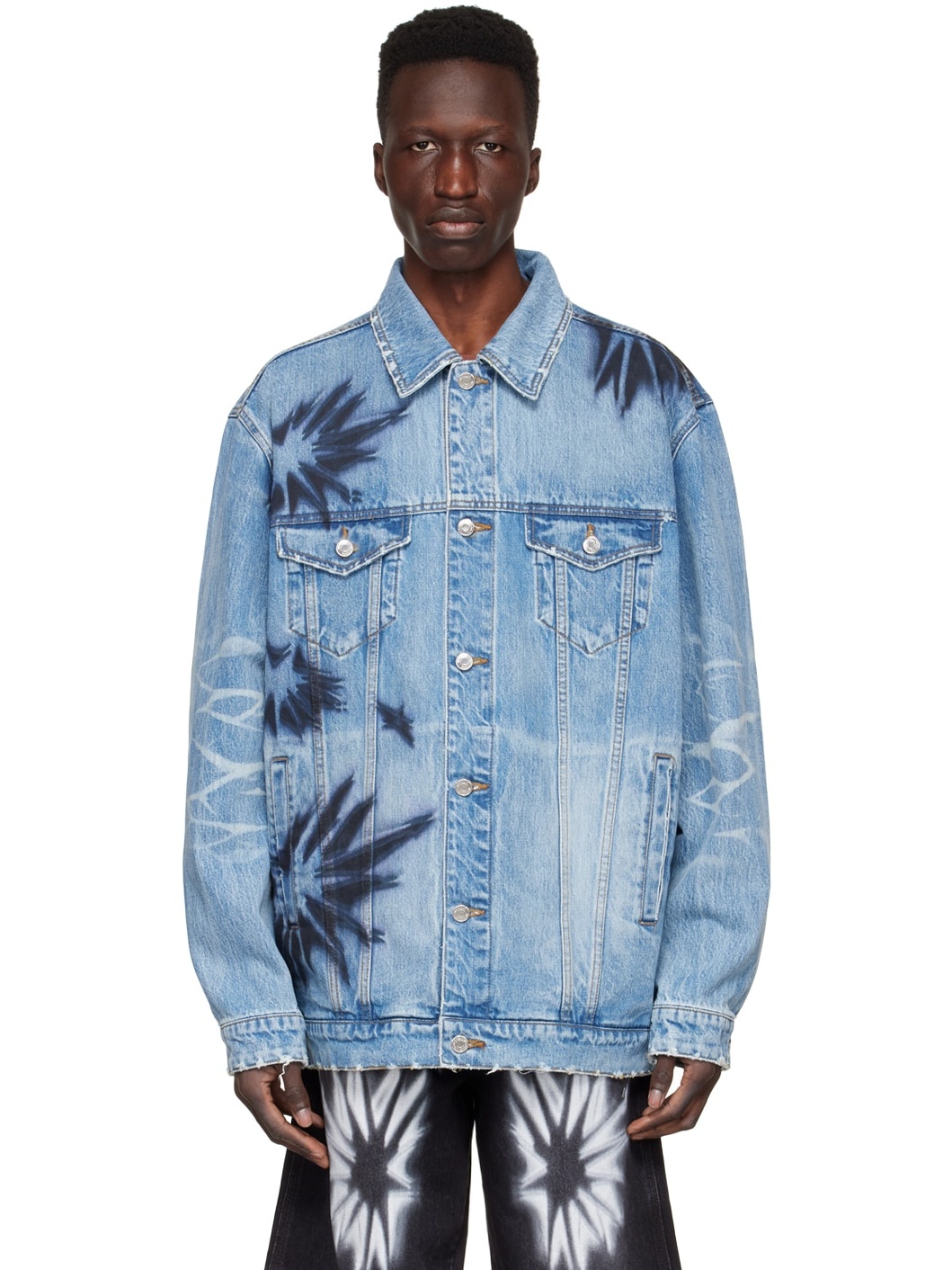 Non-stretch denim jacket. Printed graphics, fading, whiskering, and distressing throughout. · Spread collar · Button closure · Flap pockets and welt pockets · Button fastening at cuffs · Logo-engraved silver-tone hardware · Contrast stitching in tan Supplier color: Blue 100% cotton. Made in South Korea 221327M177014