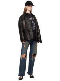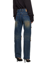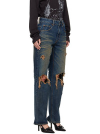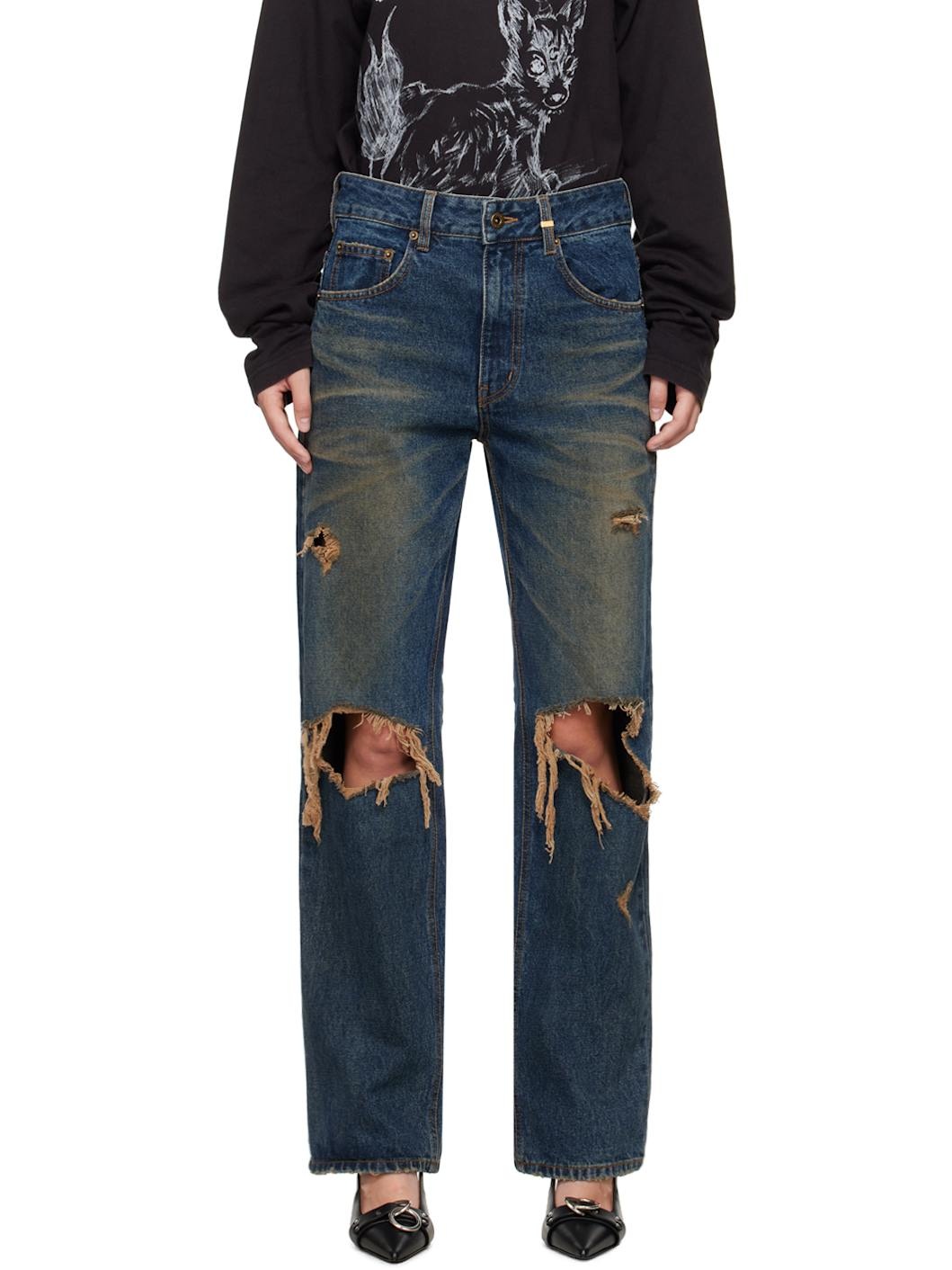 Garment-washed non-stretch cotton-blend jeans. Fading, whiskering, and distressing throughout. · Belt loops · Logo plaque at front belt loop · Five-pocket styling · Zip-fly · Rips at knees · Logo patch at back waistband · Logo-engraved antiqued gold-tone hardware · Contrast stitching in tan Supplier color: Blue 97% cotton, 3% rayon. Made in South Korea 242327F069001