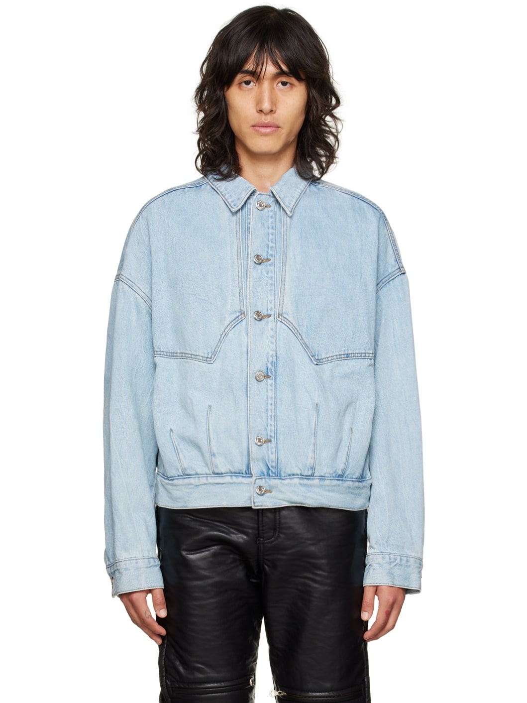 Paneled non-stretch denim jacket. Fading and darts throughout. · Spread collar · Button closure · Seam pockets · Dropped shoulders · Single-button barrel cuffs · Unlined · Logo-engraved silver-tone hardware · Contrast stitching in tan Supplier color: Sky 100% cotton. Made in South Korea 222327M177004