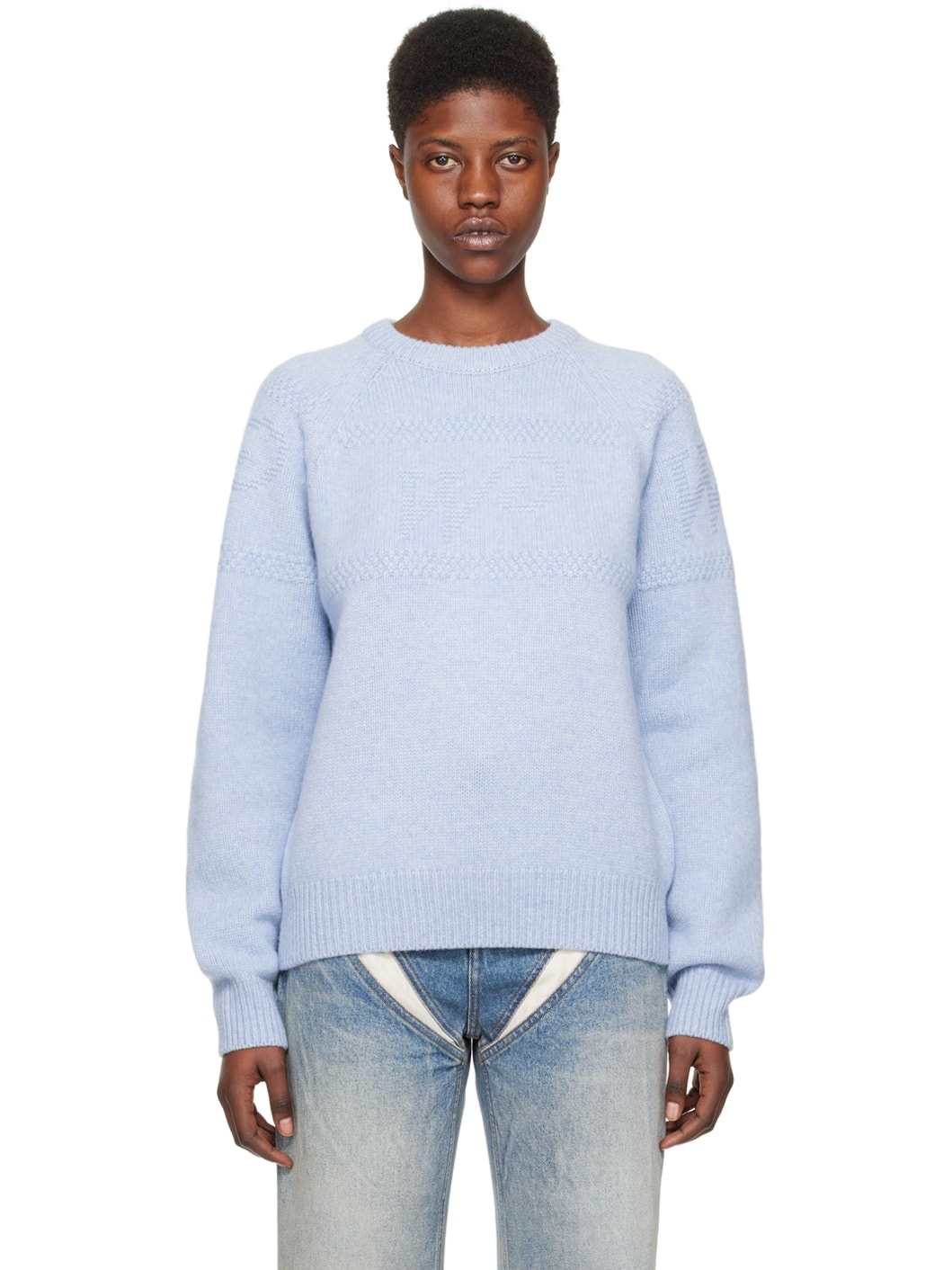 Knit wool sweater. Textured knit stripes throughout. · Rib knit crewneck, hem, and cuffs · Jacquard logo at chest and sleeves · Raglan sleeves Supplier color: Sky 100% wool. Made in South Korea 241327F096004