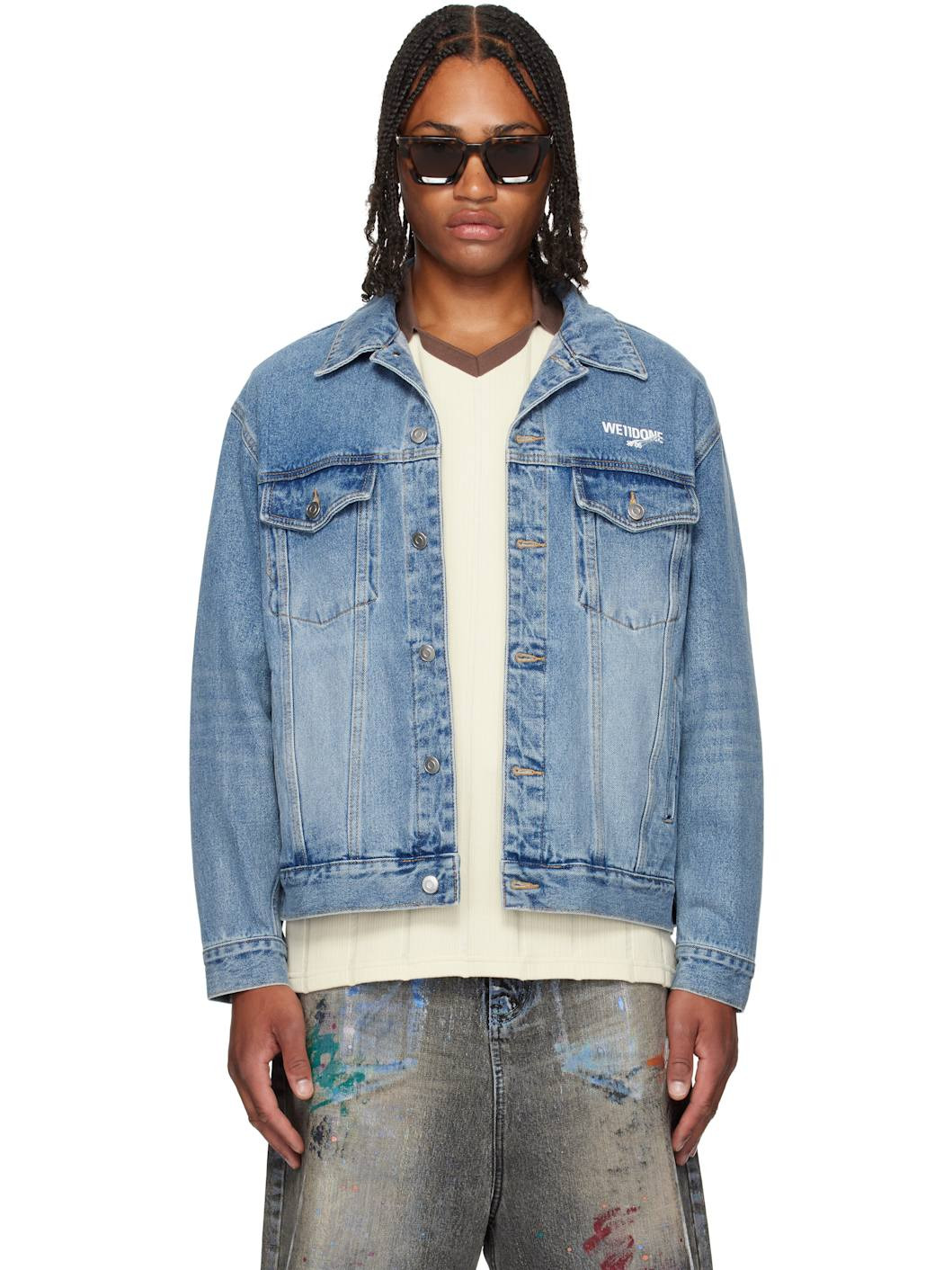 Non-stretch denim jacket. · Fading throughout · Spread collar · Button closure · Logo printed at chest and back · Flap pockets at chest · Welt pockets at waist · Whiskering at sleeves · Buttoned cuffs · Press-stud tabs at back hem · Patch pockets at interior · Silver-tone hardware · Contrast stitching in tan Supplier color: Blue 100% cotton. Made in South Korea 252327M177004