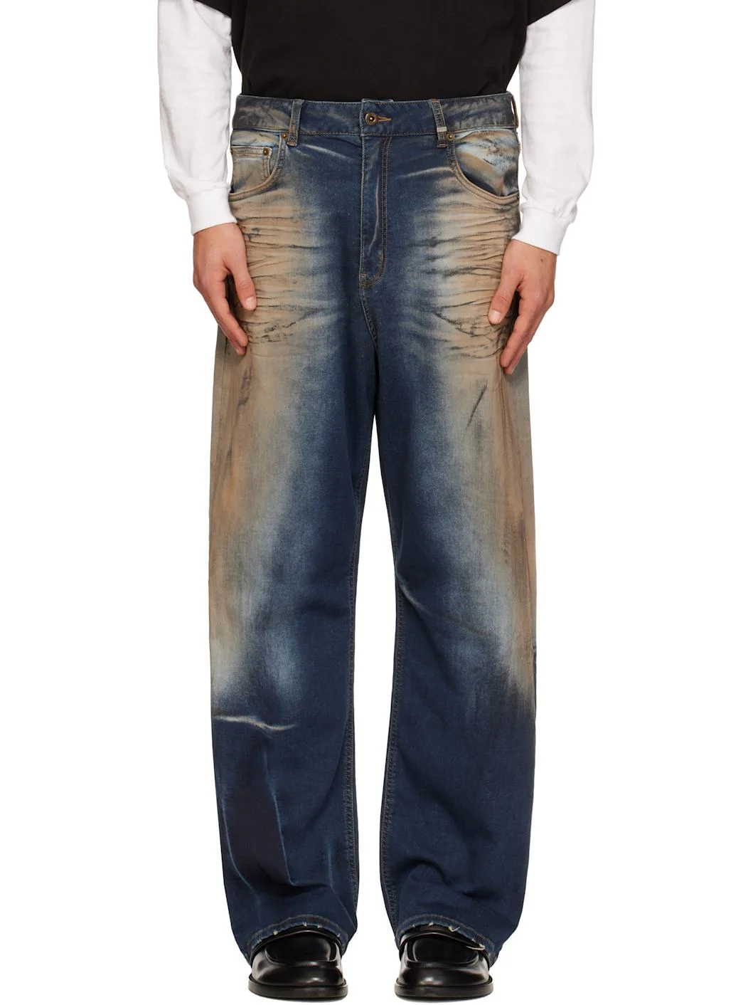 Stretch denim jeans. · Loose-fit · Fading, smudging, and whiskering throughout · Logo hardware at belt loops · Five-pocket styling · Zip fly · Jacron logo patch at back waistband · Logo-engraved antiqued gold-tone hardware Supplier color: Navy 97% cotton, 3% elastane. Made in South Korea 261327M186003