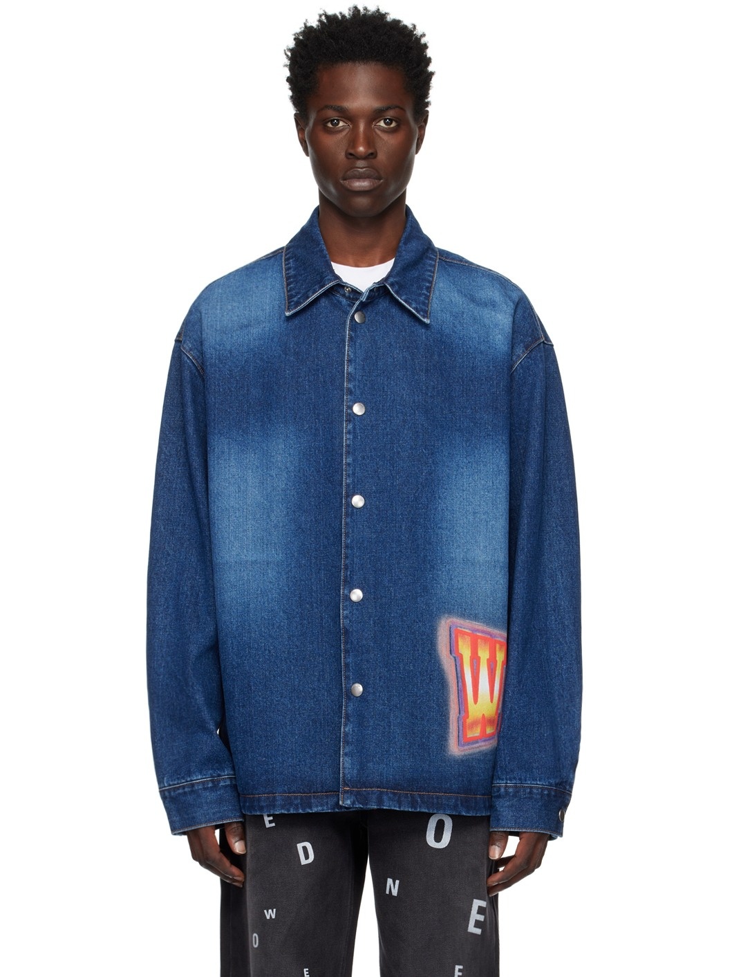 Non-stretch denim jacket. Fading throughout. · Spread collar · Press-stud closure · Welt pockets · Logo paint-effect at side seam · Press-stud barrel cuffs · Patch pockets at interior · Unlined · Logo-engraved silver-tone hardware · Contrast stitching in yellow Supplier color: Blue 100% cotton. Made in South Korea 222327M192006