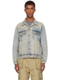 Washed non-stretch denim jacket. Fading throughout. · Paneled construction · Spread collar · Button closure · Flap and welt pockets · Dropped shoulders · Single-button barrel cuffs · Logo embroidered at back hem · Button tabs at back hem · Logo-engraved brass-tone hardware · Contrast stitching in tan Supplier color: Sky 100% cotton. Made in South Korea 242327M177015
