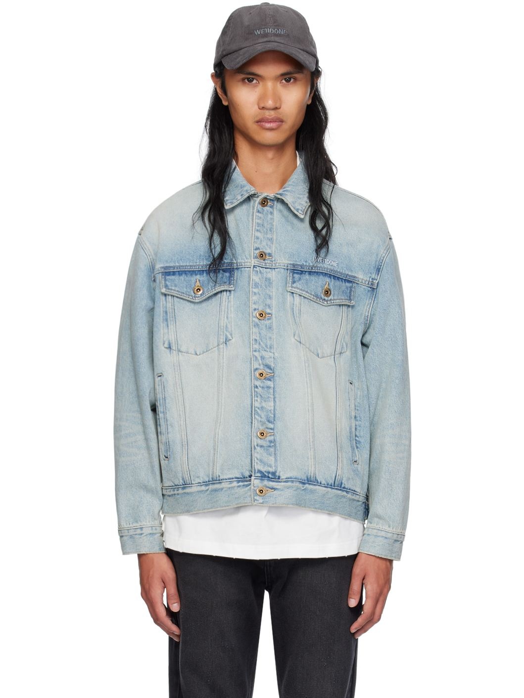 Non-stretch denim jacket. Fading throughout. · Spread collar · Button closure · Logo embroidered at chest · Flap and welt pockets · Dropped shoulders · Single-button barrel cuffs · Adjustable button tabs at back hem · Logo-engraved antiqued gold-tone hardware · Contrast stitching in beige Supplier color: Sky 100% cotton. Made in South Korea 242327M177005