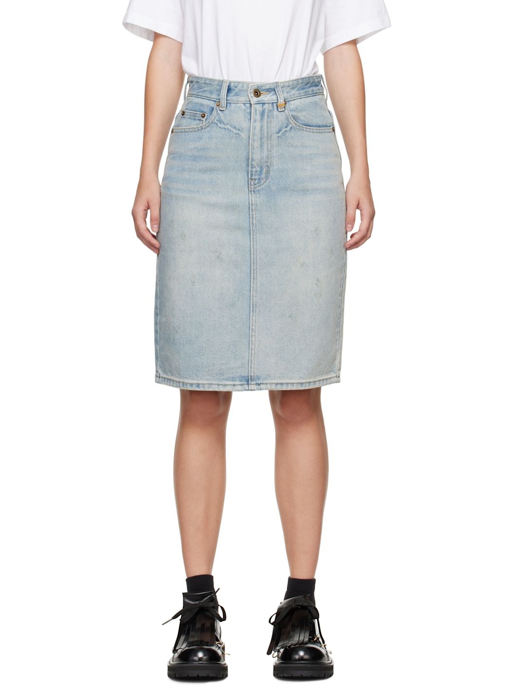 Garment-washed non-stretch denim skirt. Fading, whiskering, and subtle distressing throughout. · Belt loops · Logo plaque at front belt loop · Five-pocket styling · Zip-fly · Logo patch at back waistband · Central vent at back hem · Logo-engraved antiqued gold-tone hardware · Contrast stitching in beige Supplier color: Sky 100% cotton. Made in China 242327F092001