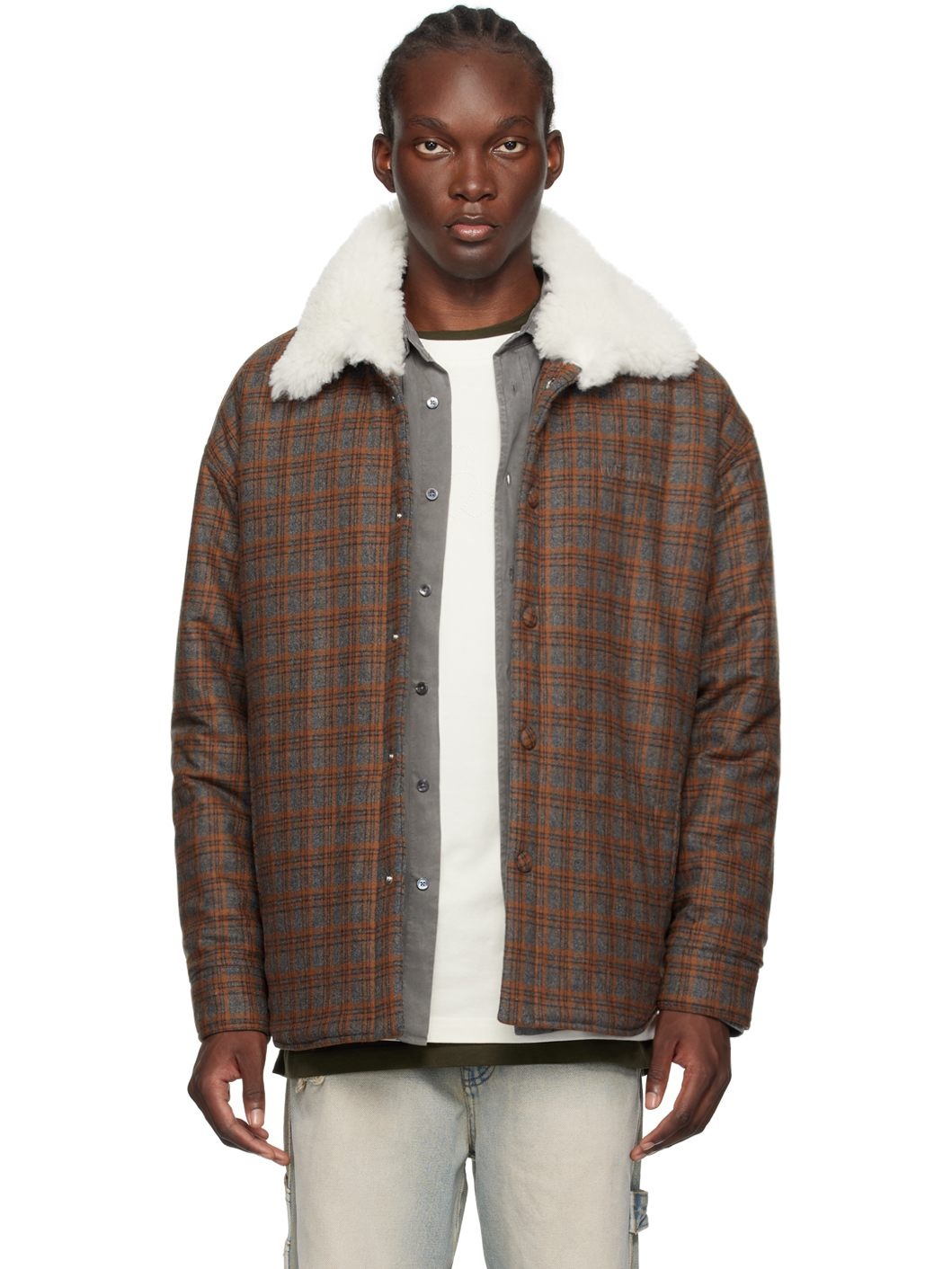 Insulated stretch wool-blend melton jacket. Check pattern printed throughout. · Faux-shearling trim at spread collar · Press-stud closure · Logo applique at chest · Curved hem · Welt pockets · Dropped shoulders · Single-button barrel cuffs · Box pleat at back yoke · Welt pockets at interior · Full quilted satin lining Supplier color: Brown Body: 67% wool, 29% nylon, 2% acrylic, 1% rayon, 1% polyurethane. Trim: 100% wool. Fill: 100% polyester. Lining: 100% polyester. Made in South Korea 242327M180003